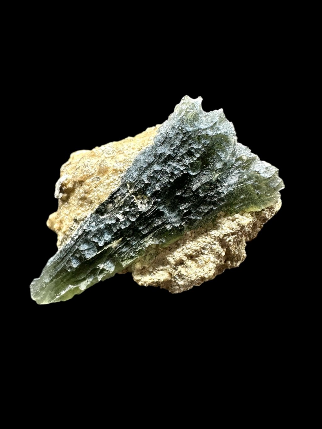 Dimensionen des Moldavites: 4,6 x 2,1 x 0,9 cm