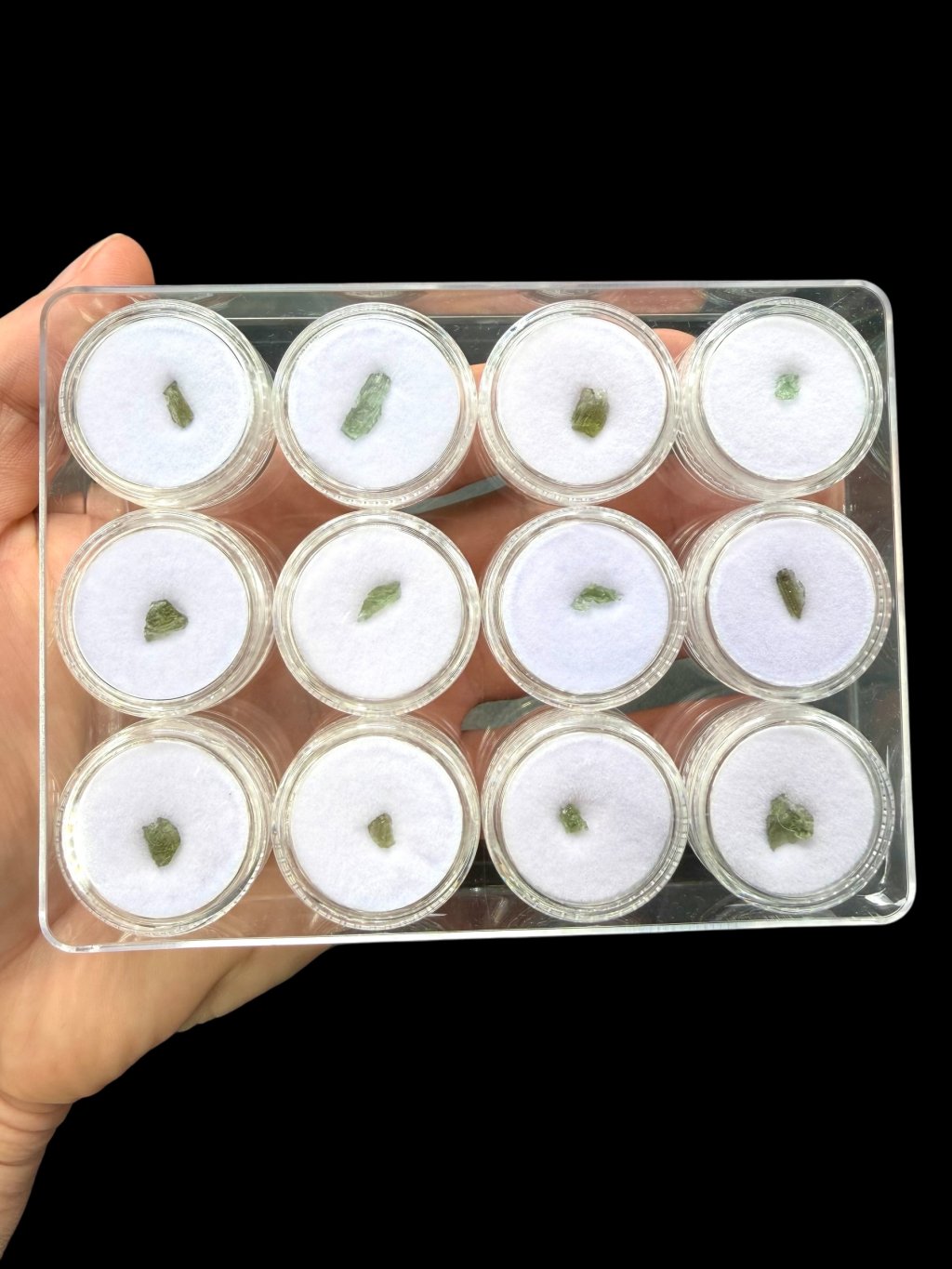 Moldavite in Boxen, 12 Stück (zufälliges Stück)
