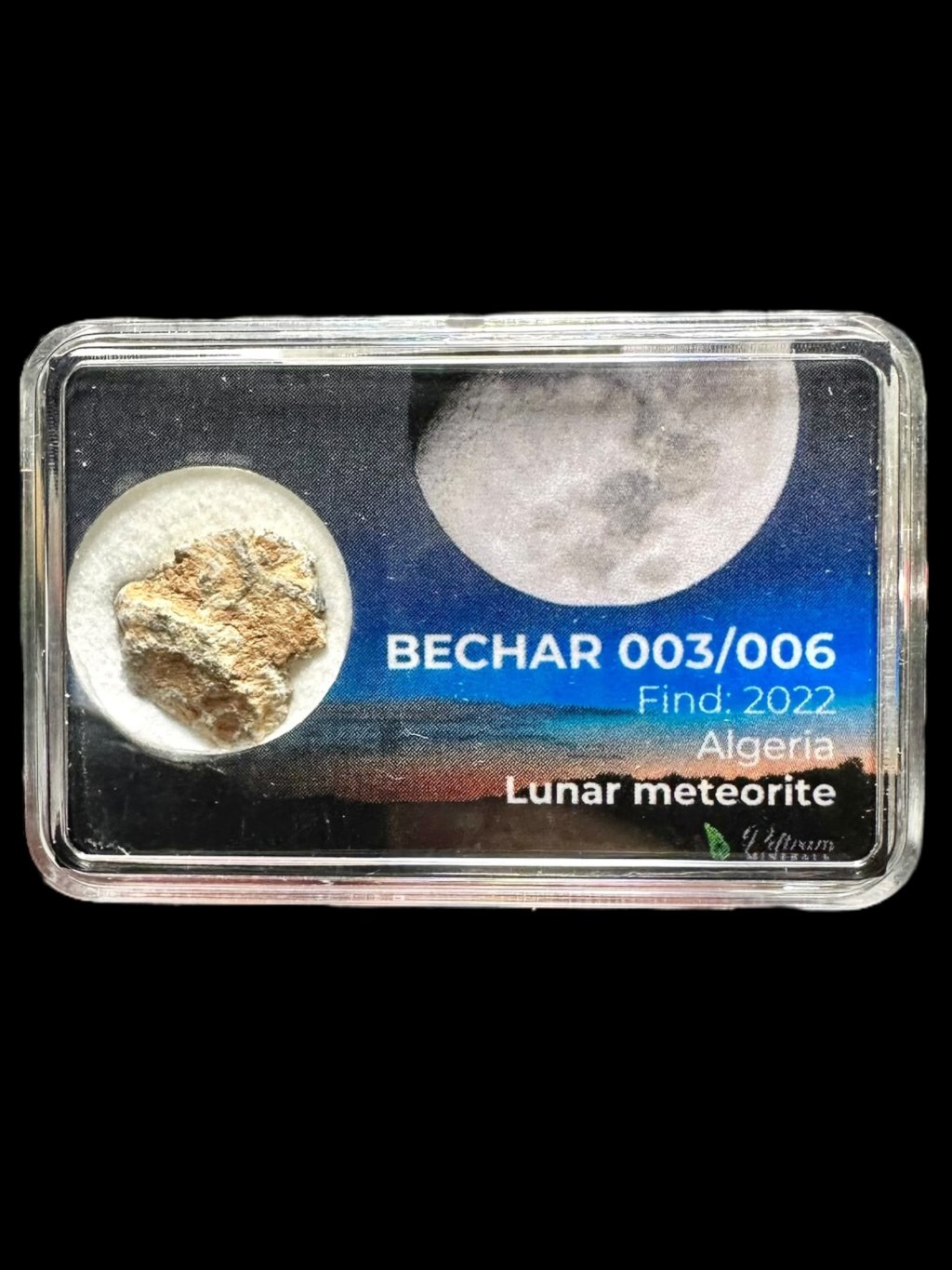 Der Bechar-Meteorit wurde am 24. März 2022 in Algerien entdeckt und wird als Mondbrekzie eingestuft, eine Gesteinsart, die sich aus verschiedenen Gesteins- und Mineralfragmenten zusammensetzt, die in der Regel durch Einschläge auf dem Mond entstanden sind. Der Bechar-Meteorit besteht aus vielen kleinen Steinen, die keine Schmelzkruste haben. Diese Steine haben eine hellbraune, von Verwitterung geprägte Oberfläche, während ihr Inneres dunkelgrau ist. Im Inneren sind winzige weiße Klasten und seltene kleine Metallkörner zu sehen.