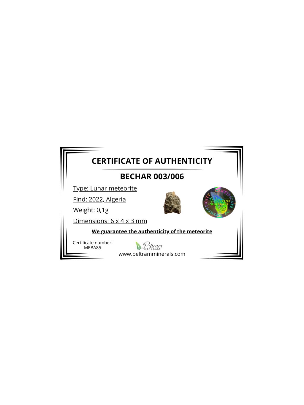 Der Bechar-Meteorit wurde am 24. März 2022 in Algerien entdeckt und wird als Mondbrekzie eingestuft, eine Gesteinsart, die sich aus verschiedenen Gesteins- und Mineralfragmenten zusammensetzt, die in der Regel durch Einschläge auf dem Mond entstanden sind. Der Bechar-Meteorit besteht aus vielen kleinen Steinen, die keine Schmelzkruste haben. Diese Steine haben eine hellbraune, von Verwitterung geprägte Oberfläche, während ihr Inneres dunkelgrau ist. Im Inneren sind winzige weiße Klasten und seltene kleine Metallkörner zu sehen.