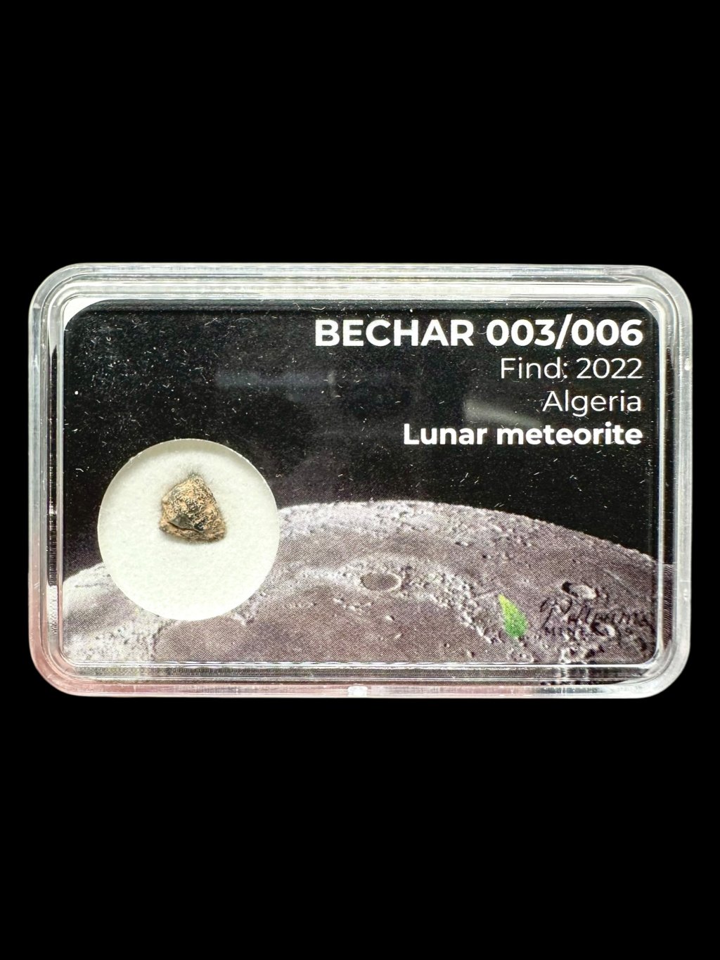 Bechar 003 ist ein lunare Meteorit, der durch den Einschlag eines Asteroiden auf der Mondoberfläche entstand und dabei Material ins All schleuderte. Ein Teil dieses Materials kann, wenn er schnell genug ist, dem Schwerefeld des Mondes entkommen und in Richtung Erde fliegen. Der Flug kann Tausende bis Millionen Jahre dauern, bevor der Meteorit in die Erdatmosphäre eintritt und auf der Erde landet. Der Mond, unser nächster Himmelskörper, macht nur 0,08 % aller bekannten Meteoriten aus, was lunare Meteoriten äußerst selten macht.