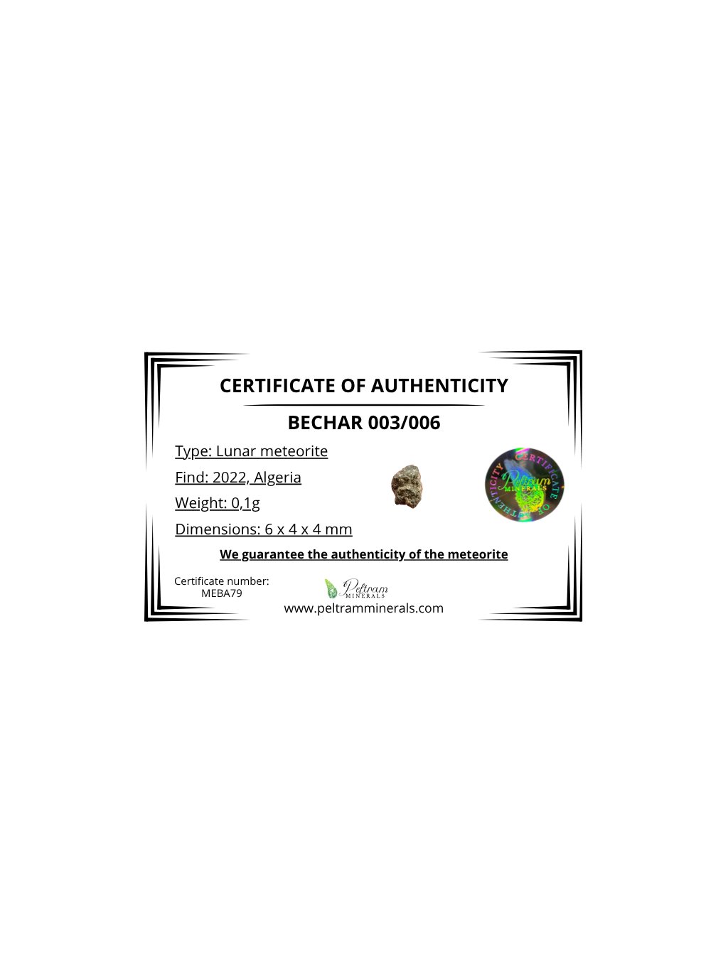Der Bechar-Meteorit wurde am 24. März 2022 in Algerien entdeckt und wird als Mondbrekzie eingestuft, eine Gesteinsart, die sich aus verschiedenen Gesteins- und Mineralfragmenten zusammensetzt, die in der Regel durch Einschläge auf dem Mond entstanden sind. Der Bechar-Meteorit besteht aus vielen kleinen Steinen, die keine Schmelzkruste haben. Diese Steine haben eine hellbraune, von Verwitterung geprägte Oberfläche, während ihr Inneres dunkelgrau ist. Im Inneren sind winzige weiße Klasten und seltene kleine Metallkörner zu sehen.