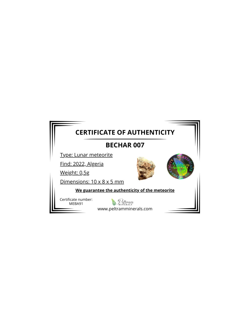 Bechar 007 ist einer der neueren lunaren Meteoriten, die auf dem afrikanischen Kontinent gefunden wurden. Sein hervorragender Erhaltungszustand, seine wissenschaftliche Bedeutung und seine ästhetische Struktur machen ihn zu einem äußerst wertvollen Exemplar für Wissenschaft und Sammler. Er gehört zu den wichtigen Mondmeteoriten und liefert einen weiteren Beweis für die Verbindung zwischen Mond und Erde durch meteoritische Einschläge.