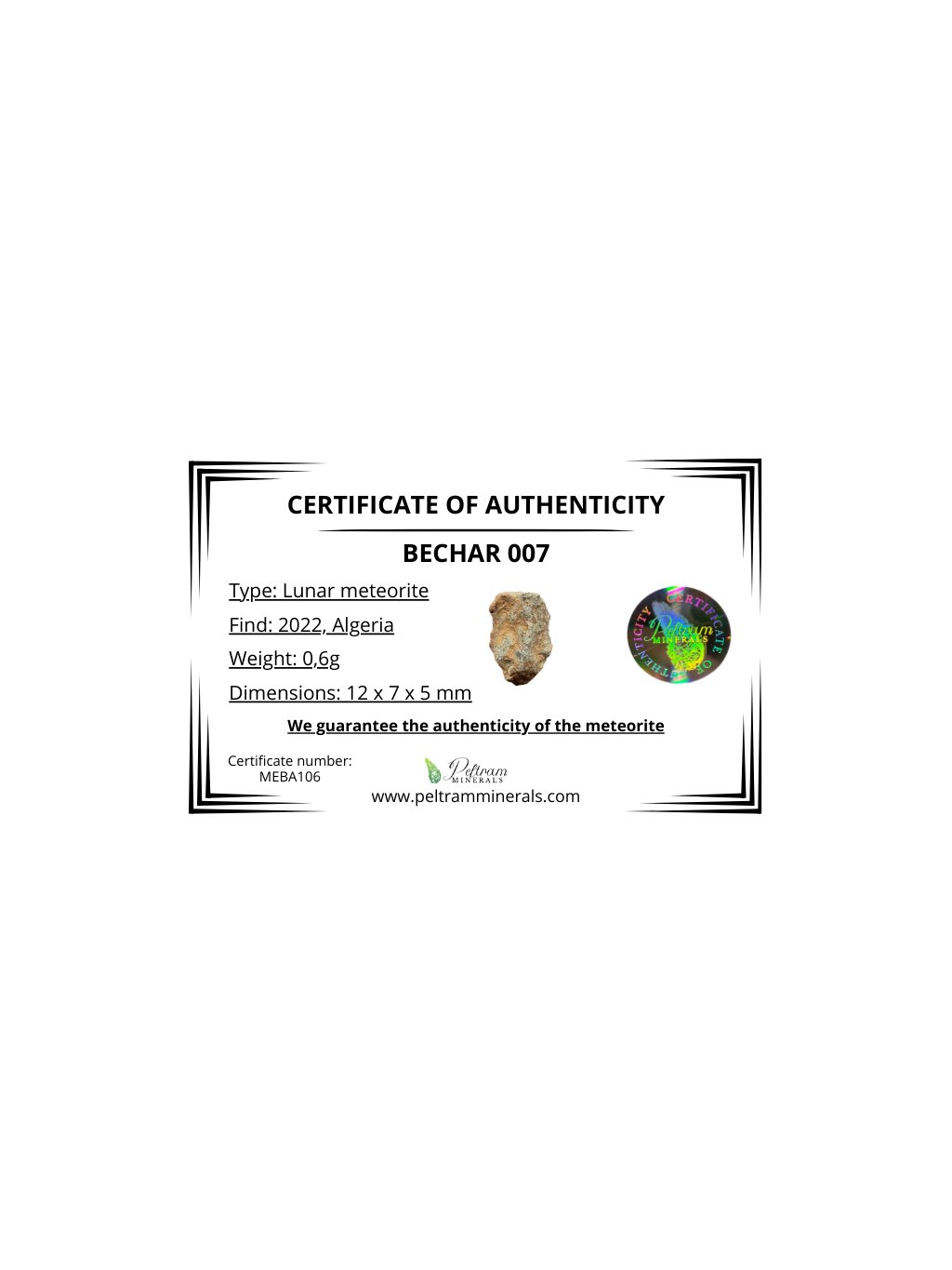 Bechar 007 ist einer der neueren lunaren Meteoriten, die auf dem afrikanischen Kontinent gefunden wurden. Sein hervorragender Erhaltungszustand, seine wissenschaftliche Bedeutung und seine ästhetische Struktur machen ihn zu einem äußerst wertvollen Exemplar für Wissenschaft und Sammler. Er gehört zu den wichtigen Mondmeteoriten und liefert einen weiteren Beweis für die Verbindung zwischen Mond und Erde durch meteoritische Einschläge.