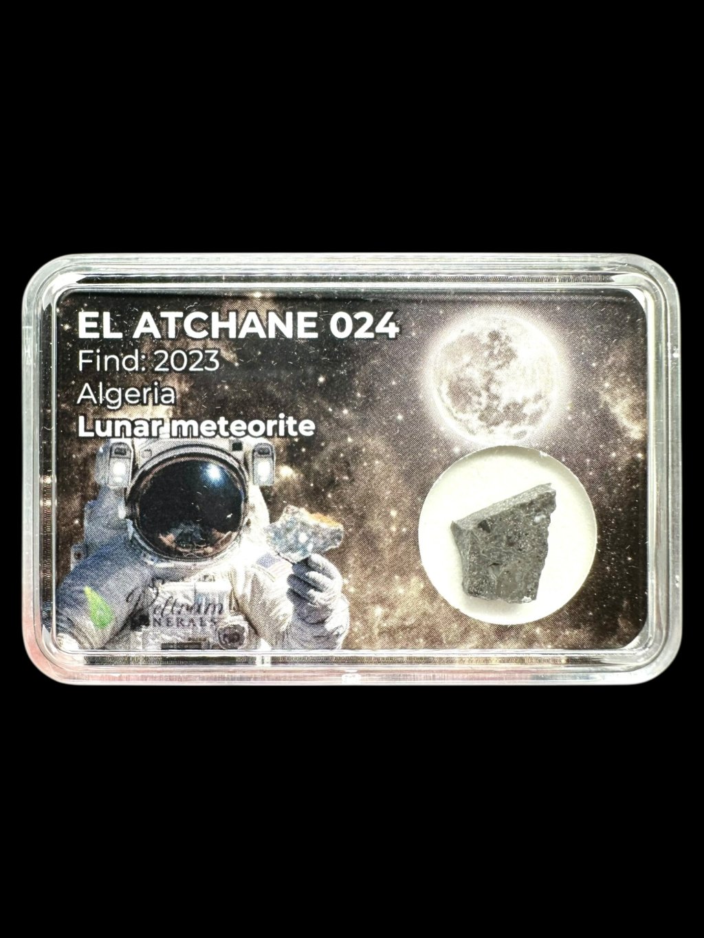 Dank seines nachgewiesenen Ursprungs, seiner seltenen Klassifikation und der gut beschriebenen Mineralogie zählt El Atchane 024 zu den wertvollsten Mondmeteoriten. Er bietet die einzigartige Möglichkeit, ein echtes Stück der mondkruste zu besitzen.