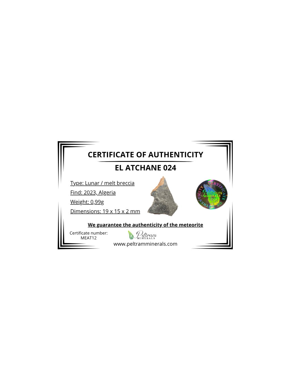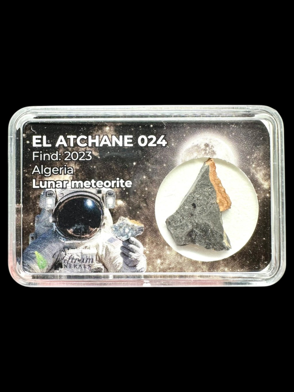 Dank seines nachgewiesenen Ursprungs, seiner seltenen Klassifikation und der gut beschriebenen Mineralogie zählt El Atchane 024 zu den wertvollsten Mondmeteoriten. Er bietet die einzigartige Möglichkeit, ein echtes Stück der mondkruste zu besitzen.