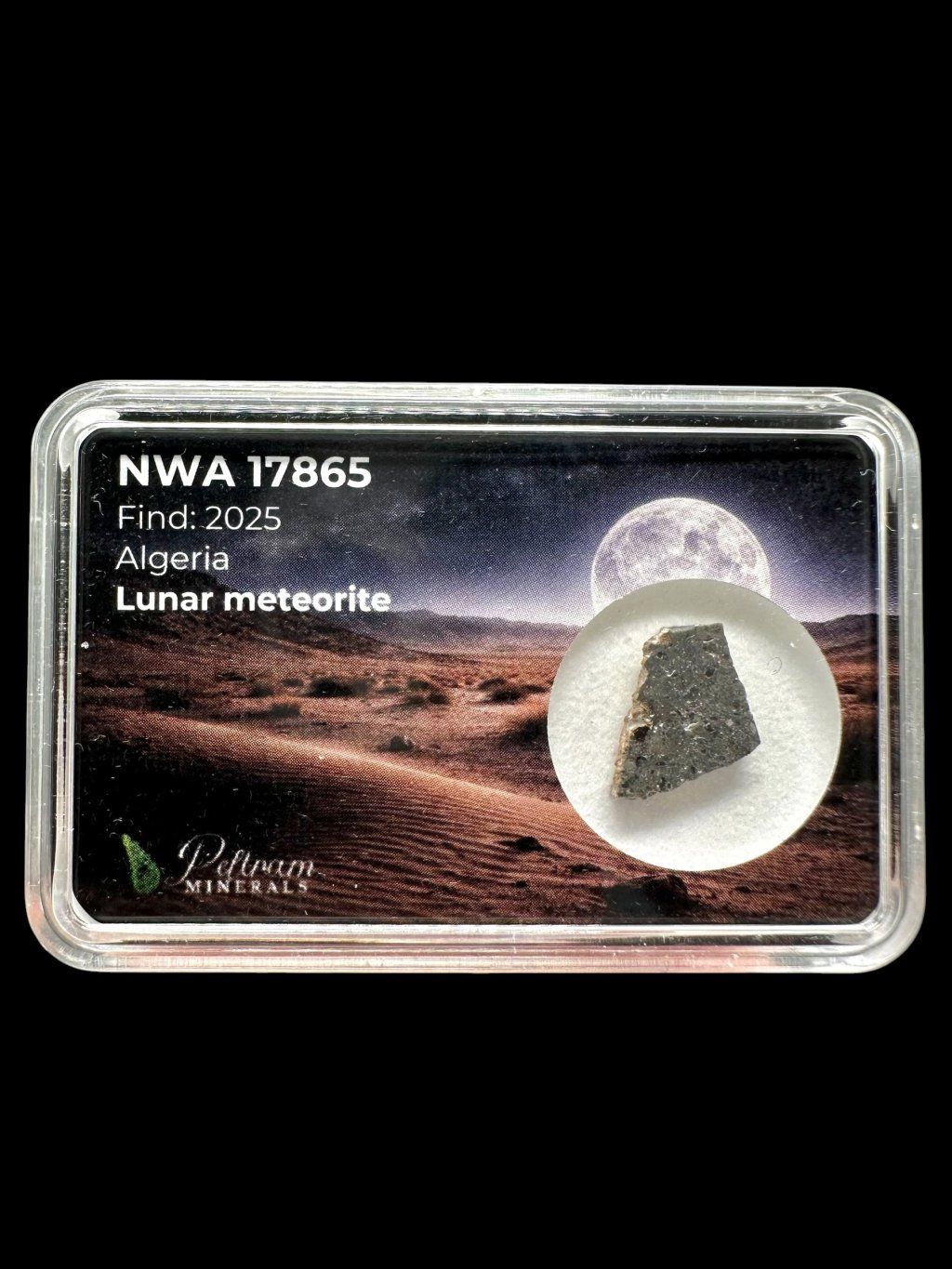 NWA 17865 ist ein außergewöhnlicher Mondmeteorit aus der algerischen Sahara, der im Jahr 2025 entdeckt wurde. Tatsächlich handelt es sich um zwei nahezu identische Steine mit einem Gewicht von 5951 g und 4249 g, was ihn zu einem bemerkenswerten Fund unter den Mondmeteoriten macht. Dieses Material stellt ein echtes Fragment der Mondkruste dar, das bei einem uralten Impakt von der Mondoberfläche ausgeworfen wurde.