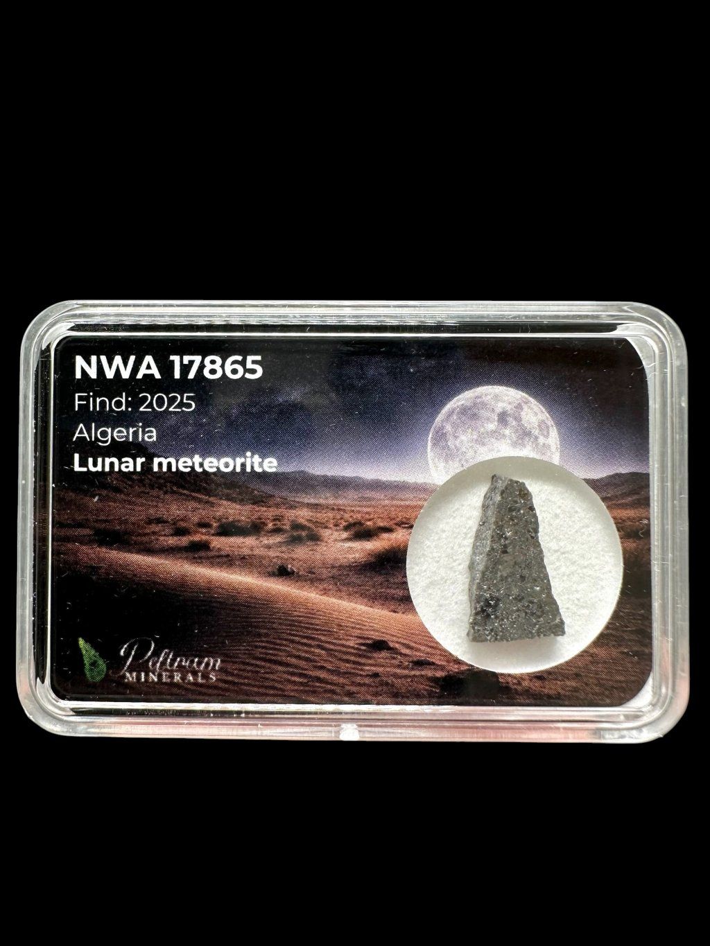 NWA 17865 ist ein außergewöhnlicher Mondmeteorit aus der algerischen Sahara, der im Jahr 2025 entdeckt wurde. Tatsächlich handelt es sich um zwei nahezu identische Steine mit einem Gewicht von 5951 g und 4249 g, was ihn zu einem bemerkenswerten Fund unter den Mondmeteoriten macht. Dieses Material stellt ein echtes Fragment der Mondkruste dar, das bei einem uralten Impakt von der Mondoberfläche ausgeworfen wurde.