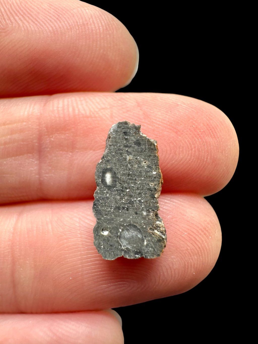 Die Oberfläche des Meteoriten ist dunkelgrau und teilweise von einer hellen Wüstenkruste bedeckt. Typisch sind auch kleine Hohlräume, sogenannte Vesikel. Im Anschnitt zeigt sich jedoch eine völlig andere Struktur – größere Gesteinsfragmente sind in einer sehr feinkörnigen Grundmasse eingebettet und bilden ein interessantes natürliches Muster.