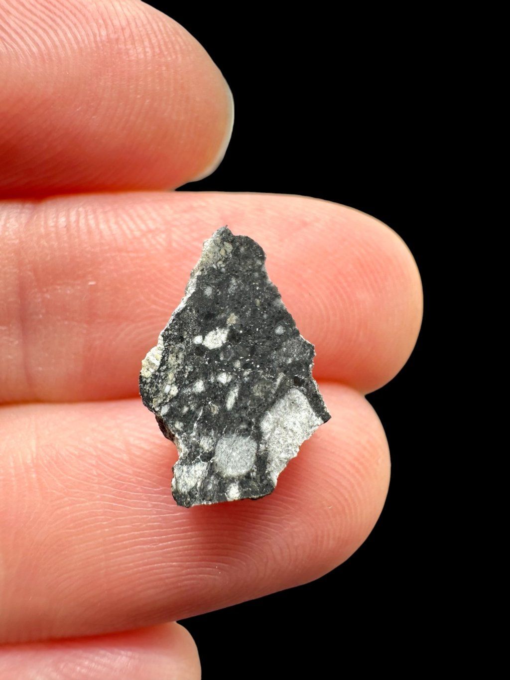 Im Anschnitt zeigt der Meteorit Ouargla 008 einen deutlichen Kontrast zwischen hellen und dunklen Bereichen. Die hellen Zonen entsprechen der ursprünglichen Mondkruste, während die dunklere Matrix durch anschließendes Aufschmelzen und Erstarren des Materials entstanden ist. Dank dieser Struktur ist jedes Stück einzigartig und optisch sehr attraktiv.