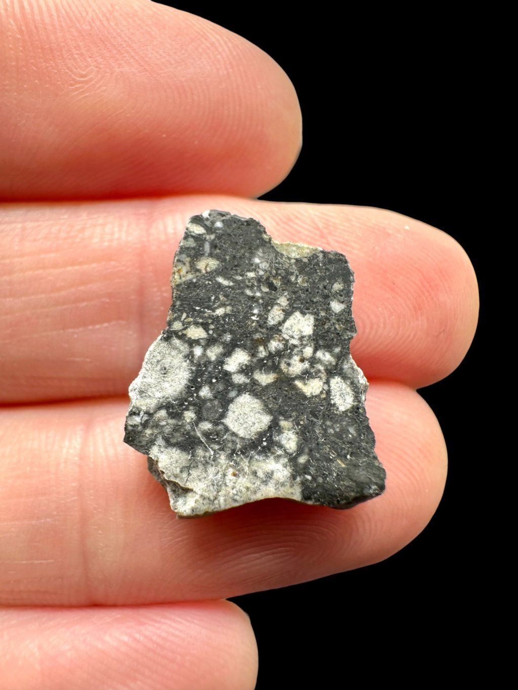 Im Anschnitt zeigt der Meteorit Ouargla 008 einen deutlichen Kontrast zwischen hellen und dunklen Bereichen. Die hellen Zonen entsprechen der ursprünglichen Mondkruste, während die dunklere Matrix durch anschließendes Aufschmelzen und Erstarren des Materials entstanden ist. Dank dieser Struktur ist jedes Stück einzigartig und optisch sehr attraktiv.