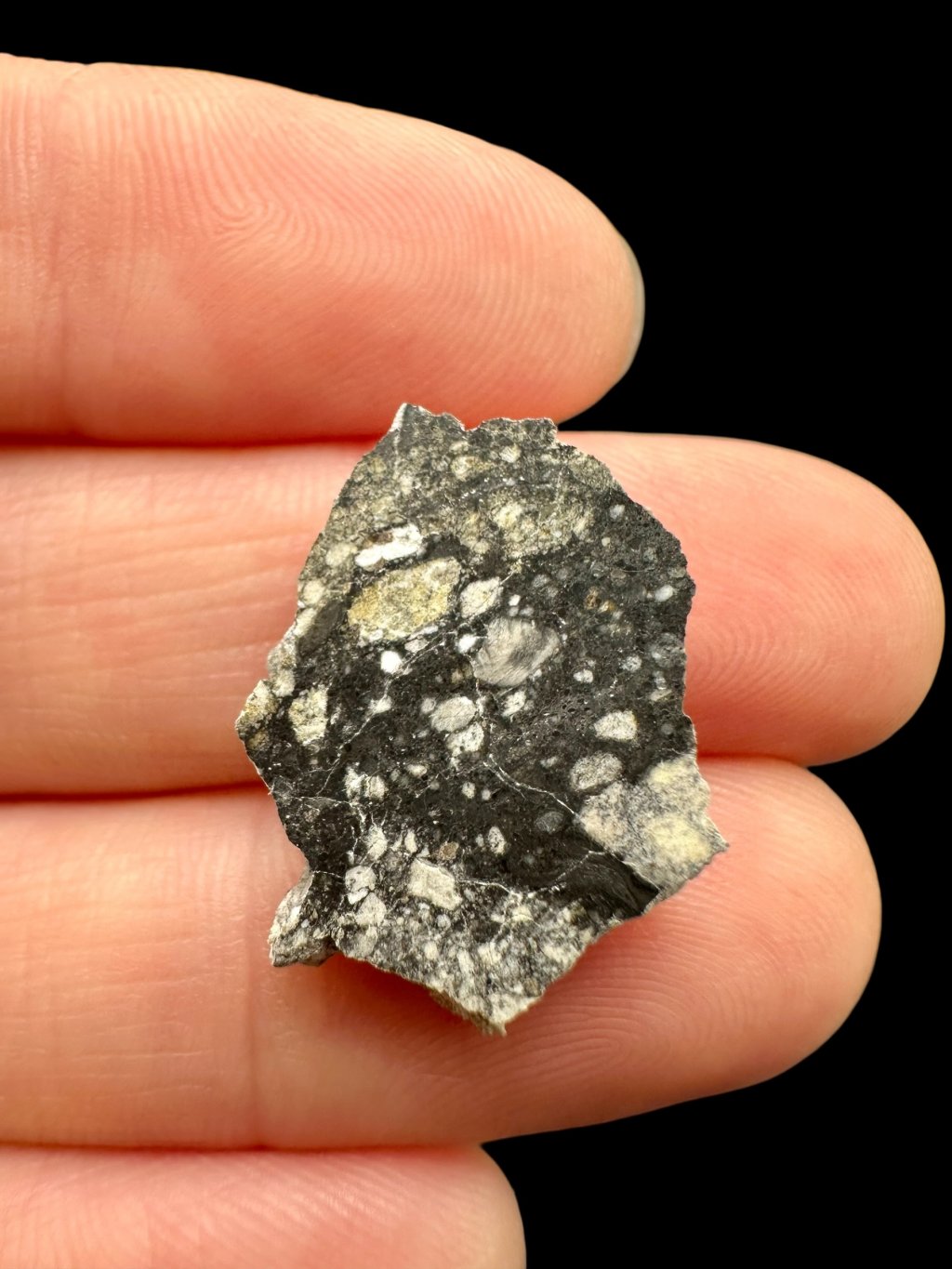 Im Anschnitt zeigt der Meteorit Ouargla 008 einen deutlichen Kontrast zwischen hellen und dunklen Bereichen. Die hellen Zonen entsprechen der ursprünglichen Mondkruste, während die dunklere Matrix durch anschließendes Aufschmelzen und Erstarren des Materials entstanden ist. Dank dieser Struktur ist jedes Stück einzigartig und optisch sehr attraktiv.