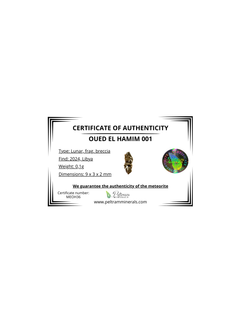 Oued El Hamim 001 ist ein seltener Mondmeteorit, der als fragmentale Brekzie klassifiziert ist. Er wurde im Jahr 2024 in der Nähe von Ajdabiya in Libyen entdeckt und hat ein Gesamtgewicht von 33,18 kg, aufgeteilt in vier größere Fragmente mit 12,6 kg, 10,8 kg, 6,0 kg und 3,78 kg.
