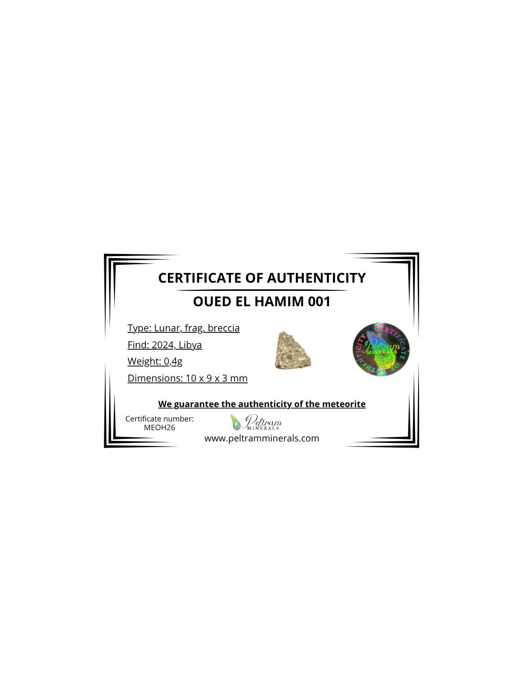 Oued El Hamim 001 ist ein seltener Mondmeteorit, der als fragmentale Brekzie klassifiziert ist. Er wurde im Jahr 2024 in der Nähe von Ajdabiya in Libyen entdeckt und hat ein Gesamtgewicht von 33,18 kg, aufgeteilt in vier größere Fragmente mit 12,6 kg, 10,8 kg, 6,0 kg und 3,78 kg.