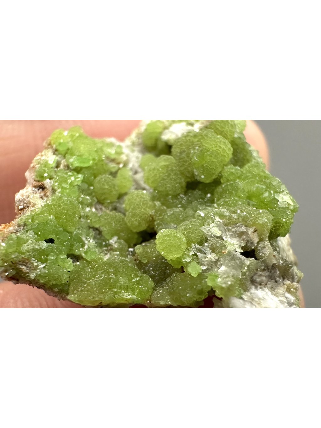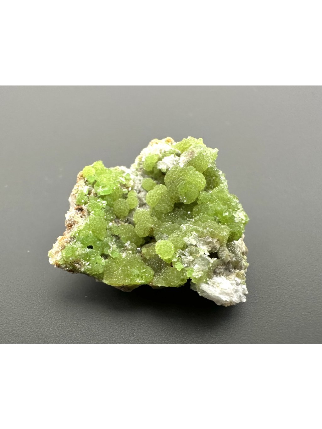 Pyromorphit kommt in einer breiten Farbpalette vor, die von leuchtend gelb, grün, braun bis orange reicht. Die grünen und gelben Varietäten sind am weitesten verbreitet und bei Sammlern am beliebtesten. Sie bilden charakteristische nadelförmige oder zylindrische Kristalle, die unterschiedliche Größen erreichen können. Pyromorphit wird manchmal in traubenförmigen oder kugelförmigen Aggregaten gefunden. Er hat einen glasigen bis harzigen Glanz, der zu seinem attraktiven Erscheinungsbild beiträgt.