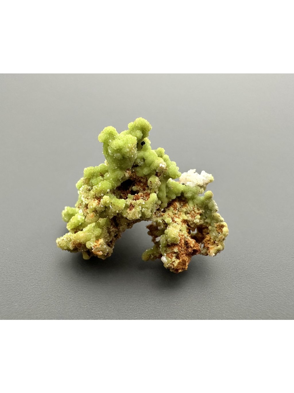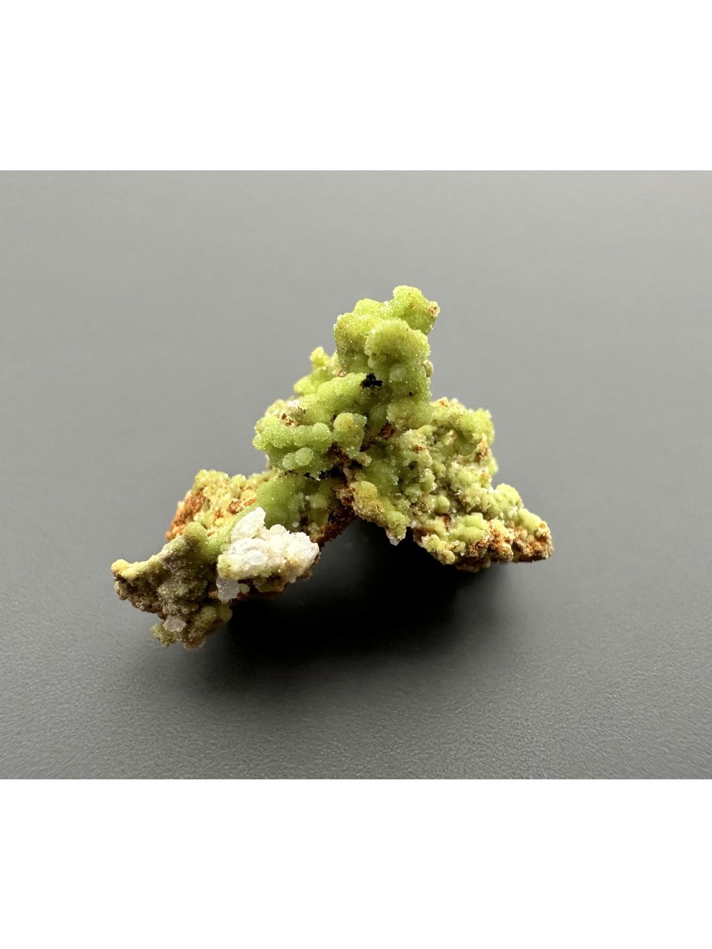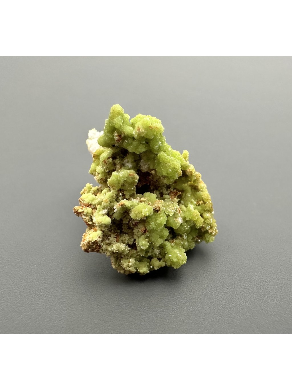 Pyromorphit kommt in einer breiten Farbpalette vor, die von leuchtend gelb, grün, braun bis orange reicht. Die grünen und gelben Varietäten sind am weitesten verbreitet und bei Sammlern am beliebtesten. Sie bilden charakteristische nadelförmige oder zylindrische Kristalle, die unterschiedliche Größen erreichen können. Pyromorphit wird manchmal in traubenförmigen oder kugelförmigen Aggregaten gefunden. Er hat einen glasigen bis harzigen Glanz, der zu seinem attraktiven Erscheinungsbild beiträgt.