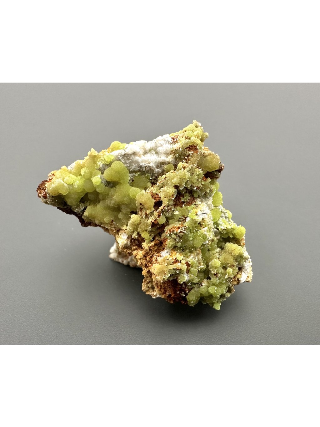 Pyromorphit kommt in einer breiten Farbpalette vor, die von leuchtend gelb, grün, braun bis orange reicht. Die grünen und gelben Varietäten sind am weitesten verbreitet und bei Sammlern am beliebtesten. Sie bilden charakteristische nadelförmige oder zylindrische Kristalle, die unterschiedliche Größen erreichen können. Pyromorphit wird manchmal in traubenförmigen oder kugelförmigen Aggregaten gefunden. Er hat einen glasigen bis harzigen Glanz, der zu seinem attraktiven Erscheinungsbild beiträgt.