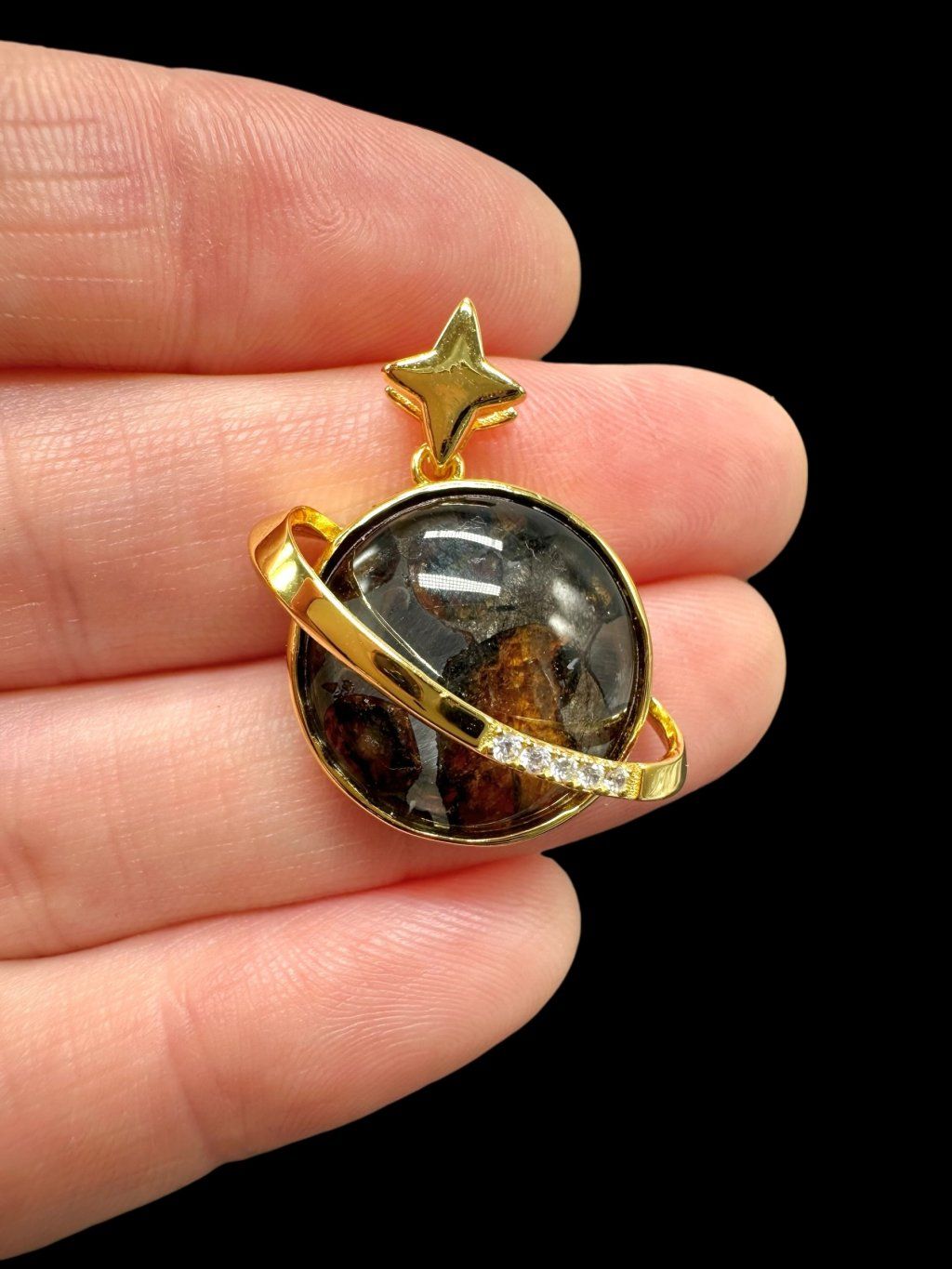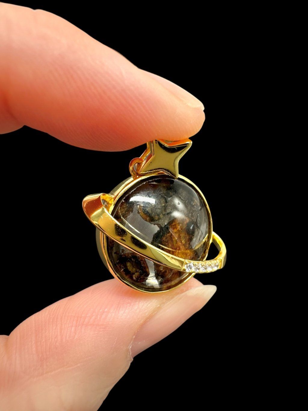 Anhänger aus dem Meteoriten Sericho enthält einen echten Pallasiten mit charakteristischen Olivin-Kristallen. Dieser seltene Meteorit stammt aus der Grenzschicht zwischen Kern und Mantel eines urzeitlichen planetaren Körpers. Jedes Stück ist ein einzigartiges Unikat und stellt ein authentisches Fragment des Universums dar.