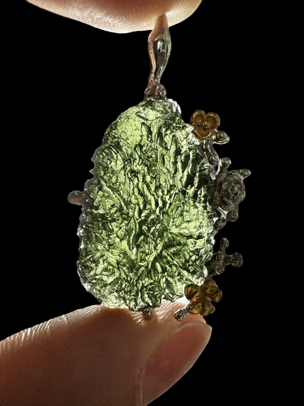 Silber Moldavit Anhänger mit vergoldeten Elementen 10,2g