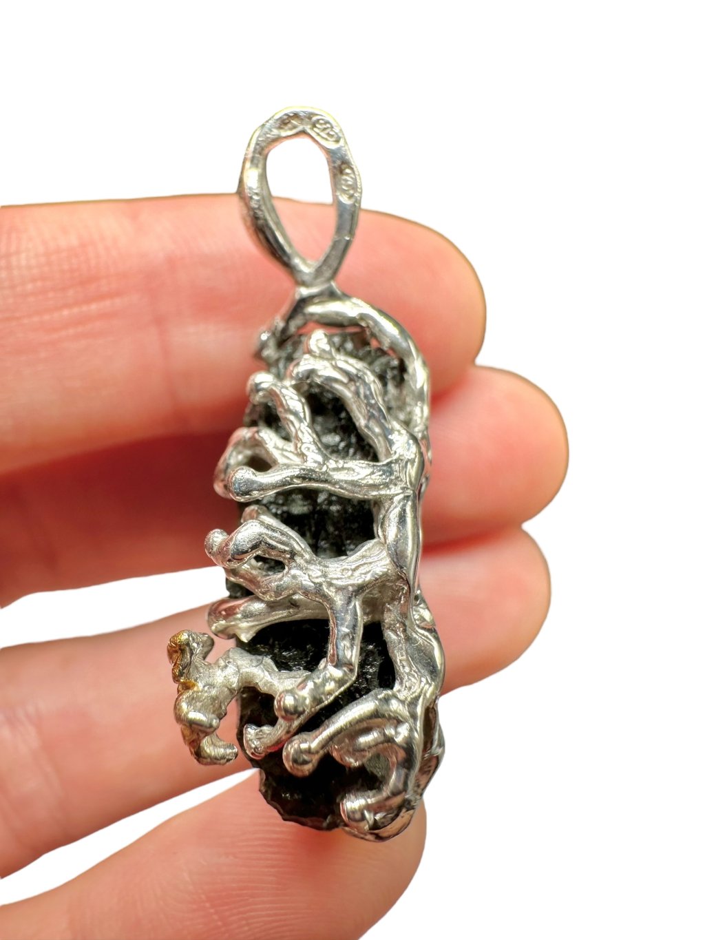 Silber Moldavit Anhänger mit vergoldeten Elementen 12g