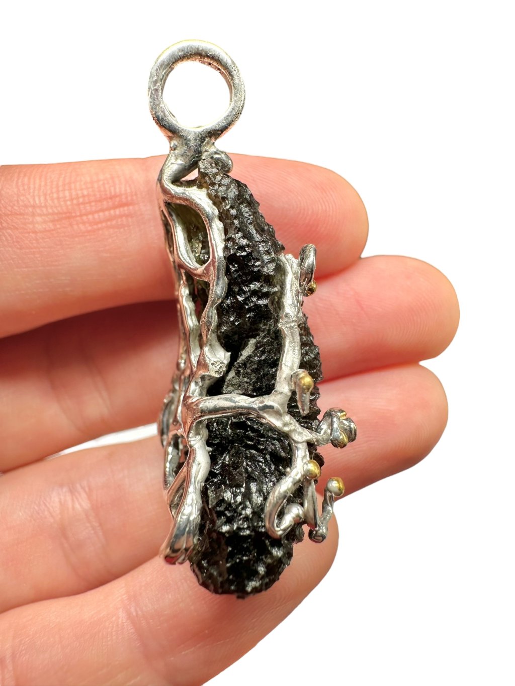 Silber Moldavit Anhänger mit vergoldeten Elementen 13g