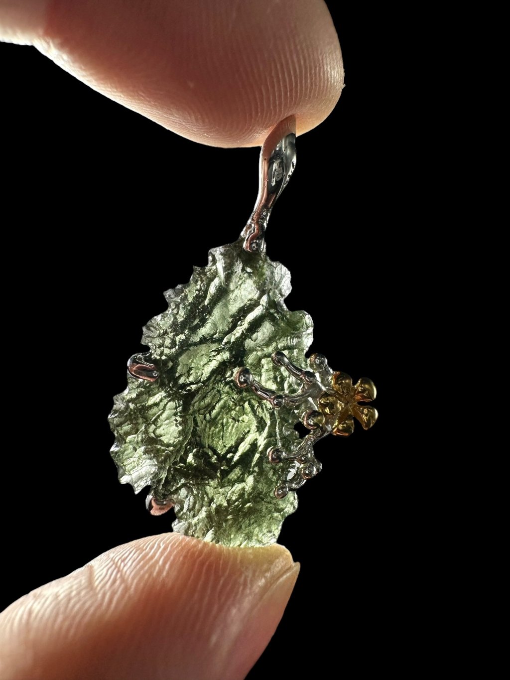 Silber Moldavit Anhänger mit vergoldeten Elementen 4,8g