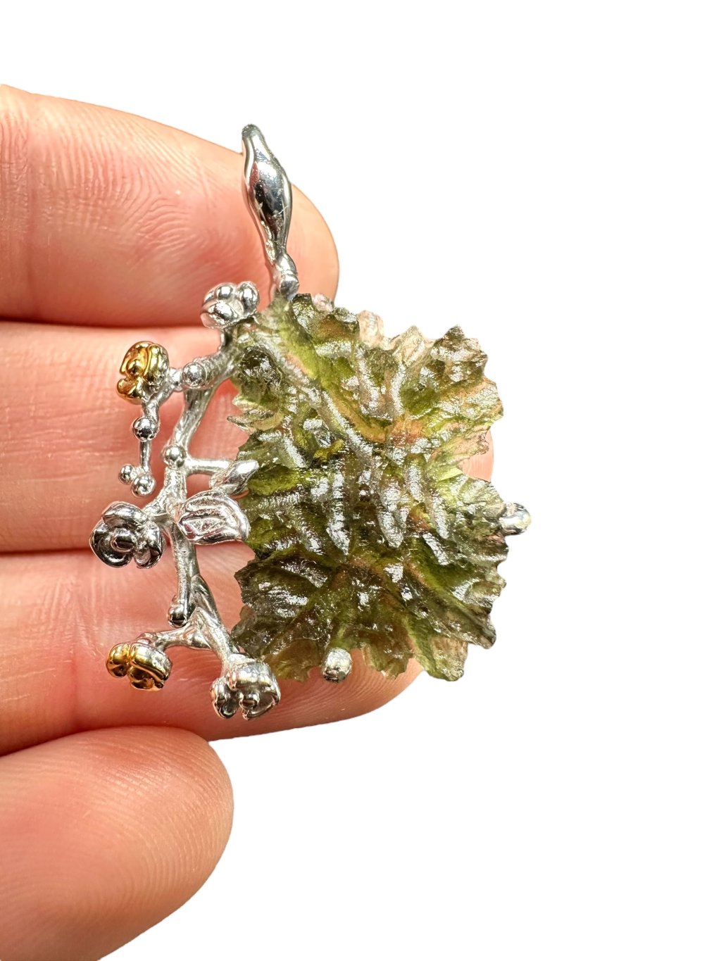 Silber Moldavit Anhänger mit vergoldeten Elementen 6,3g