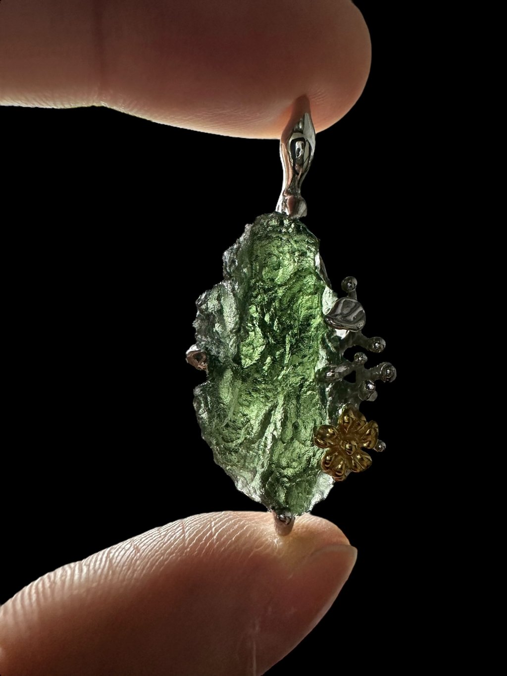 Silber Moldavit Anhänger mit vergoldeten Elementen 6,8g