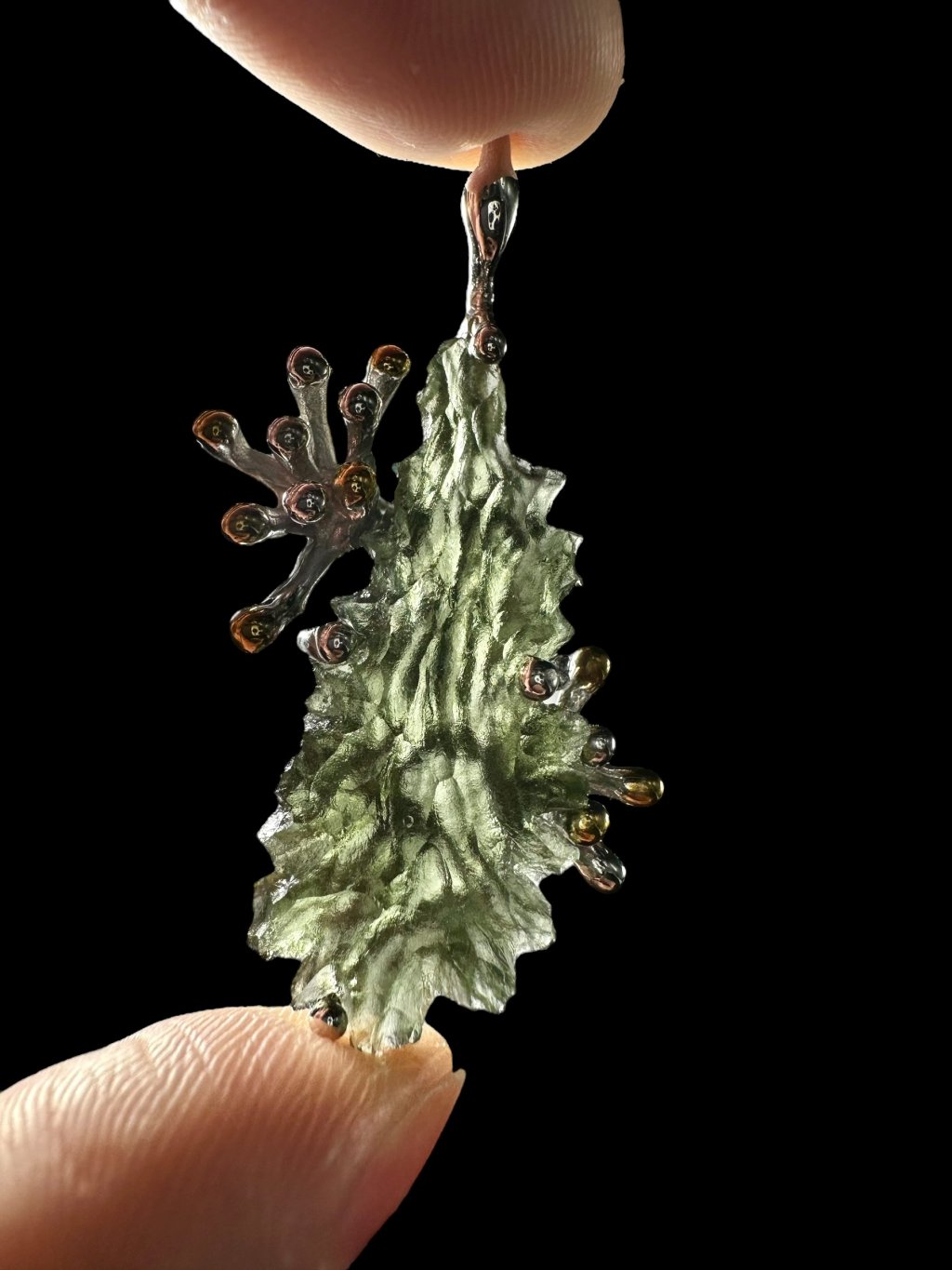 Silber Moldavit Anhänger mit vergoldeten Elementen 8,1g