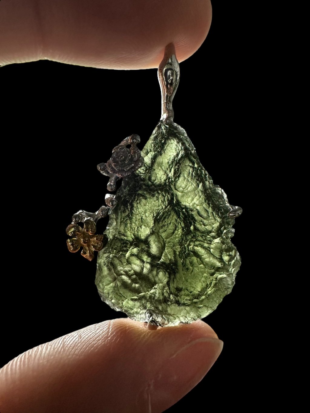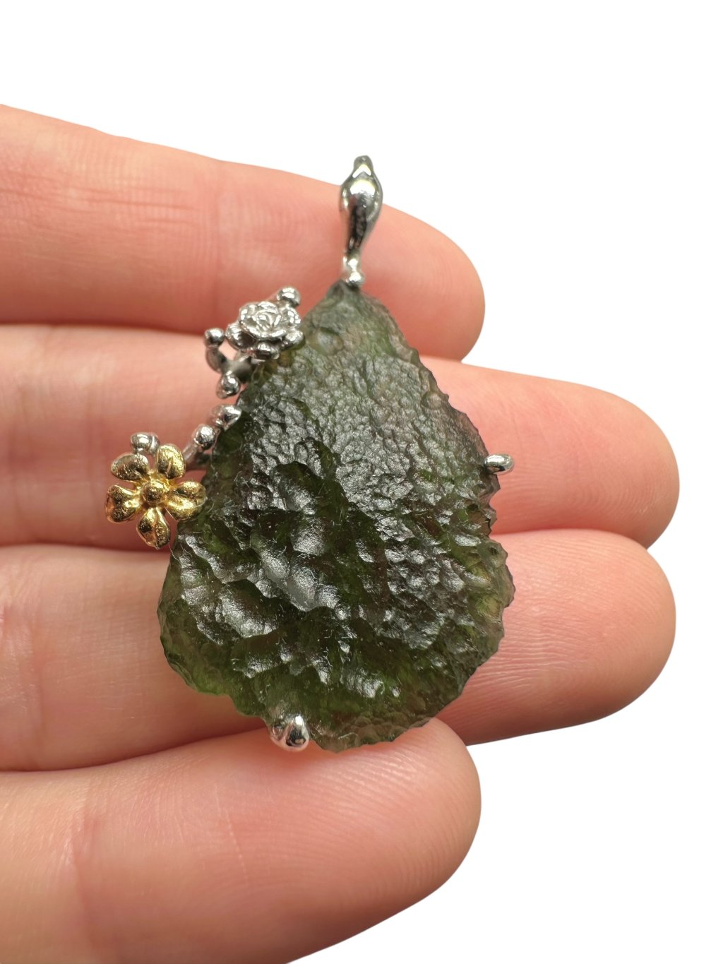 Silber Moldavit Anhänger mit vergoldeten Elementen 8,1g