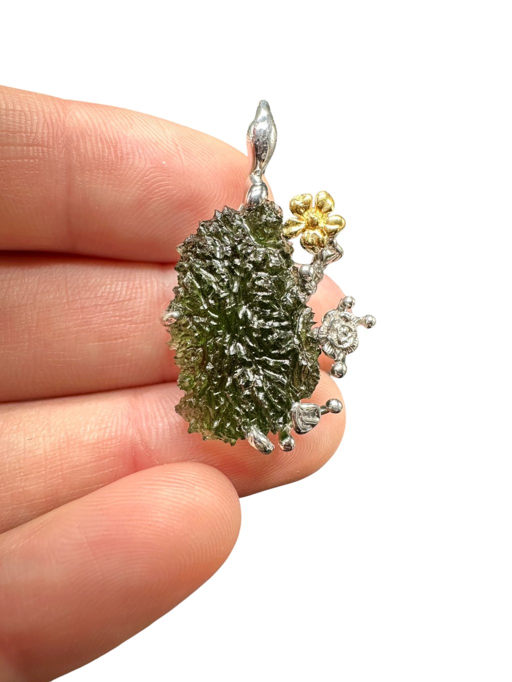 Silber Moldavit Anhänger mit vergoldeten Elementen 8g