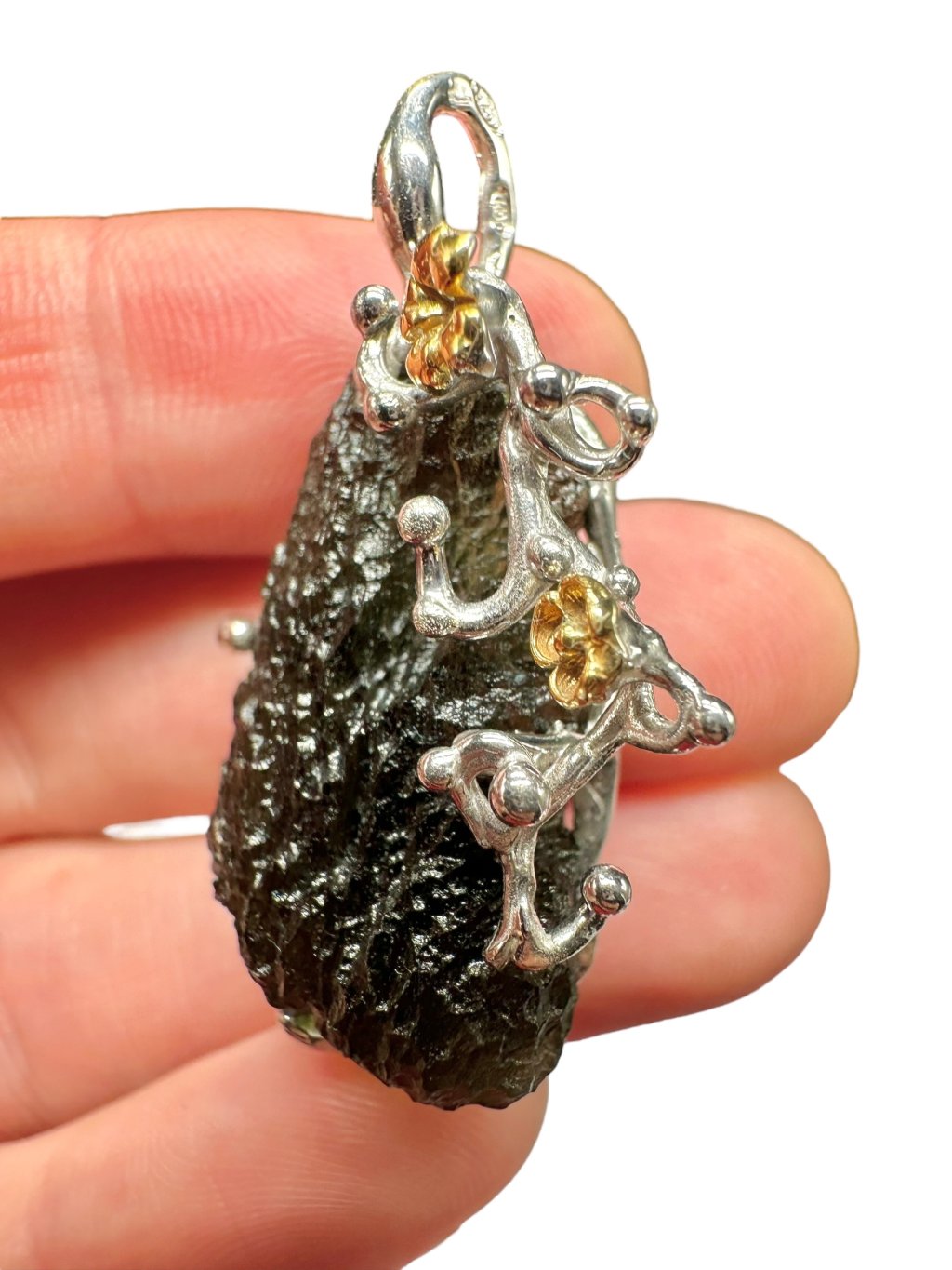Silber Moldavit Anhänger mit vergoldeten Elementen 9,8g