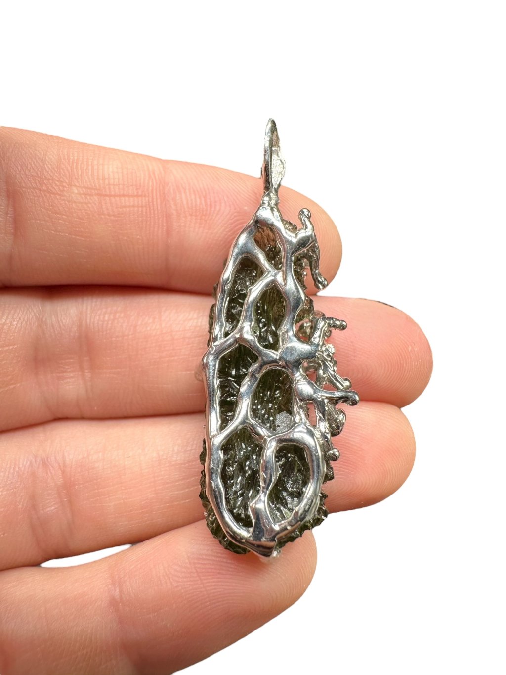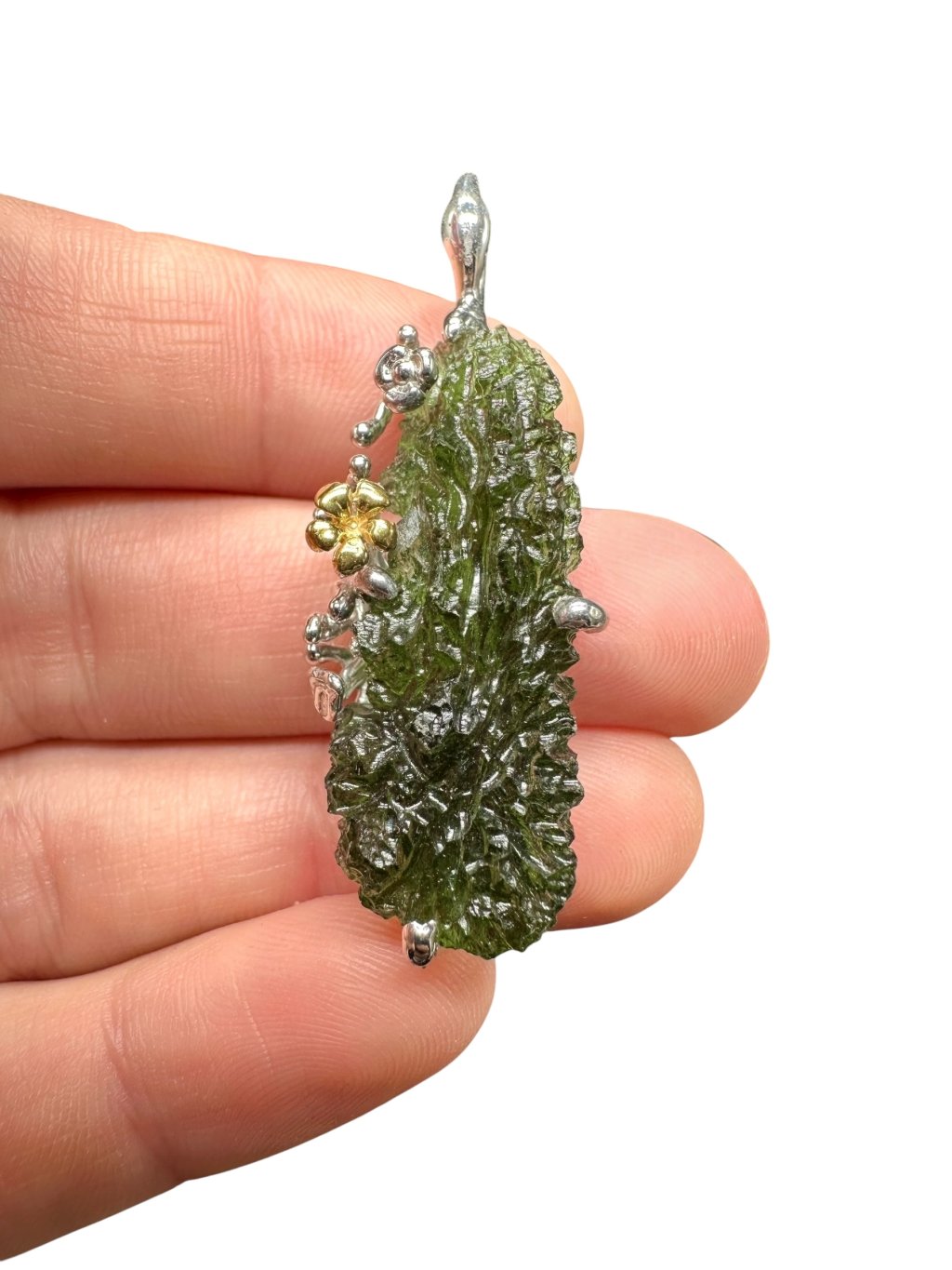 Silber Moldavit Anhänger mit vergoldeten Elementen 9g