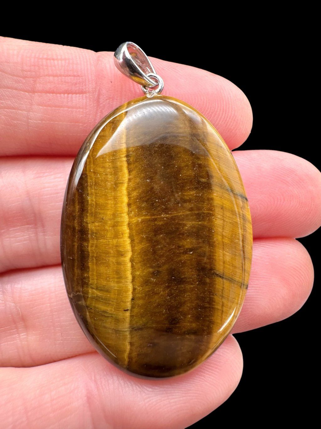 Tigerauge ist eine natürliche Quarzvarietät, die für ihre charakteristische goldbraune Farbe und den ausgeprägten optischen Effekt, bekannt als Chatoyance, bekannt ist. Dieses optische Phänomen erzeugt ein schmales Lichtband, das sich beim Bewegen des Steins scheinbar über seine Oberfläche bewegt. Die Farbnuancen reichen von hellem Goldton bis zu dunklem Braun, oft mit natürlichen Übergängen und Zeichnungen.