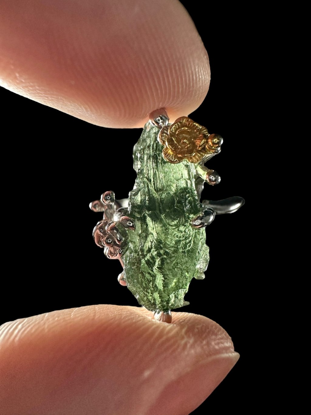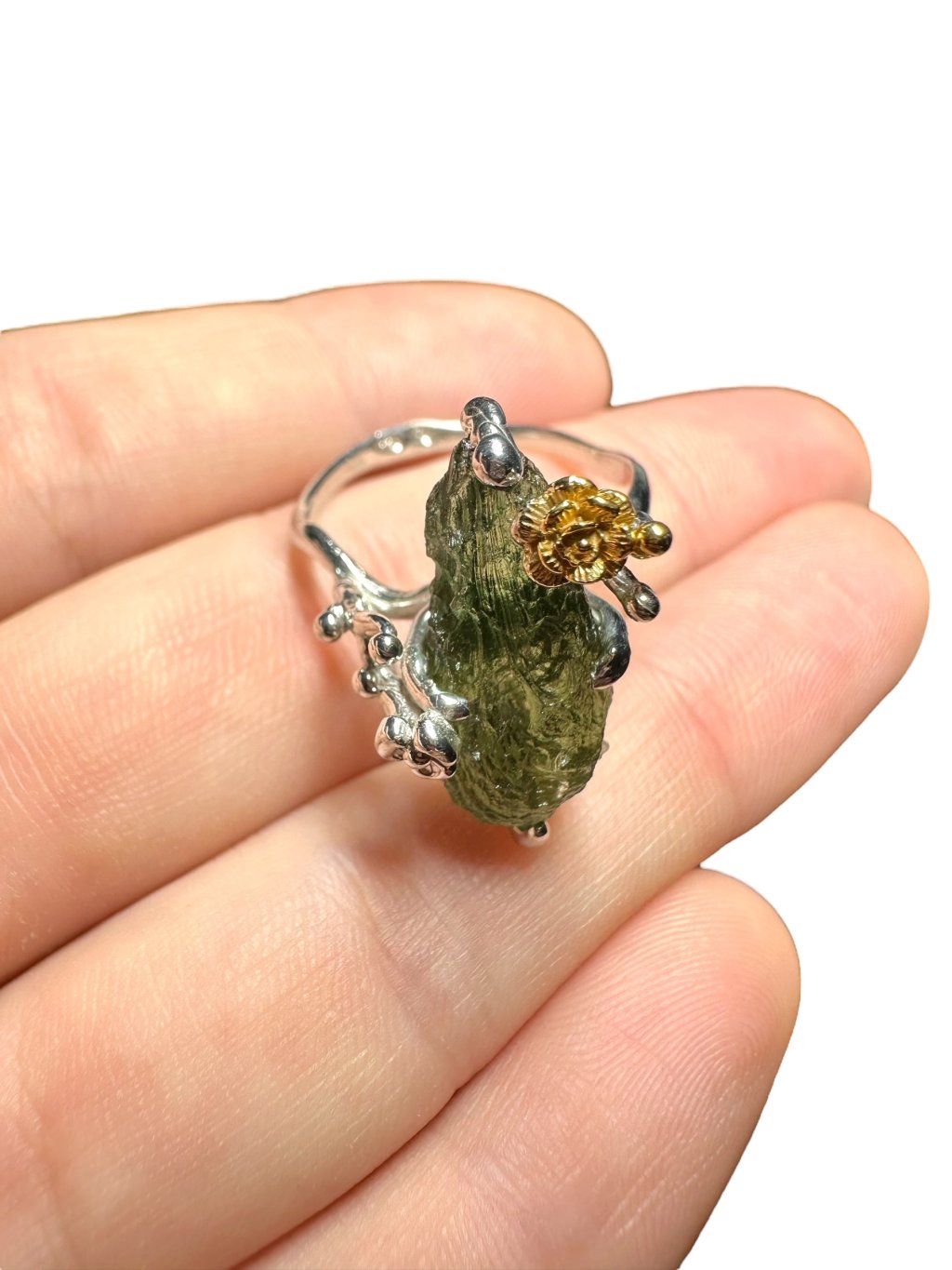 Silberring mit Moldavit mit vergoldeten Elementen 4,7g