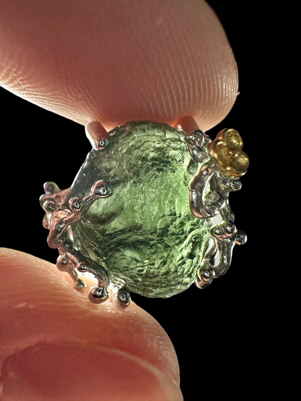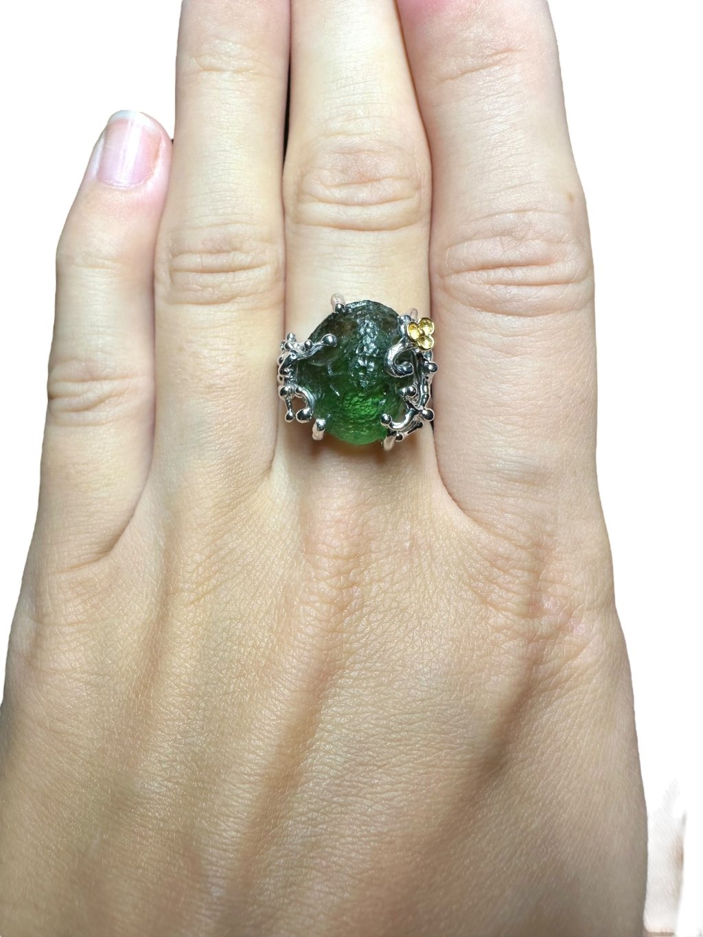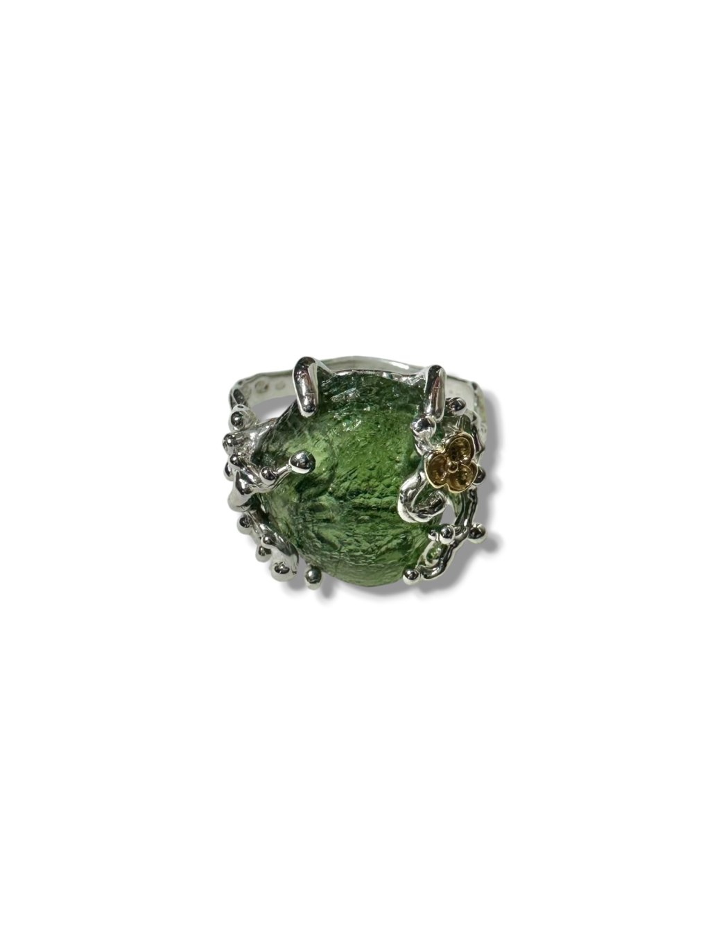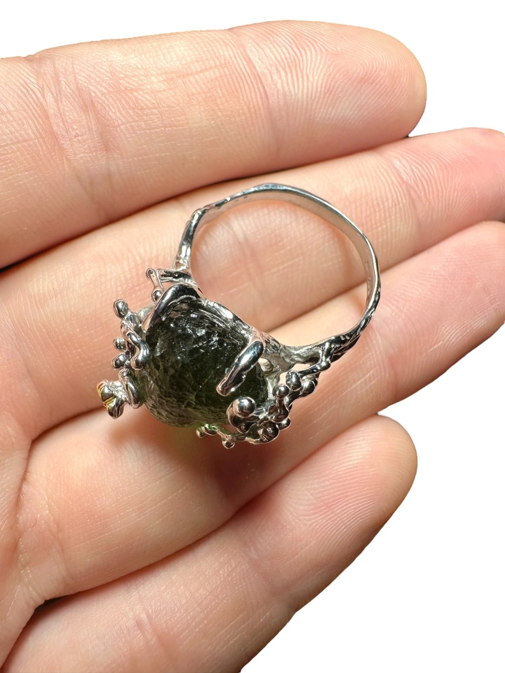 Silberring mit Moldavit mit vergoldeten Elementen 5,9g