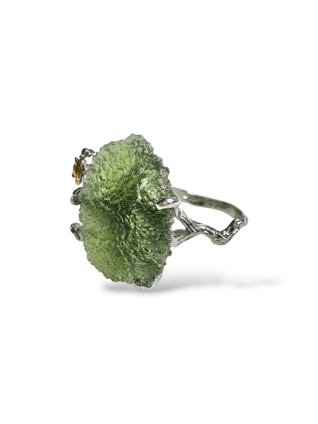Silberring mit Moldavit mit vergoldeten Elementen 8g