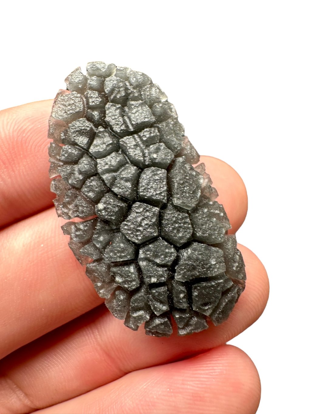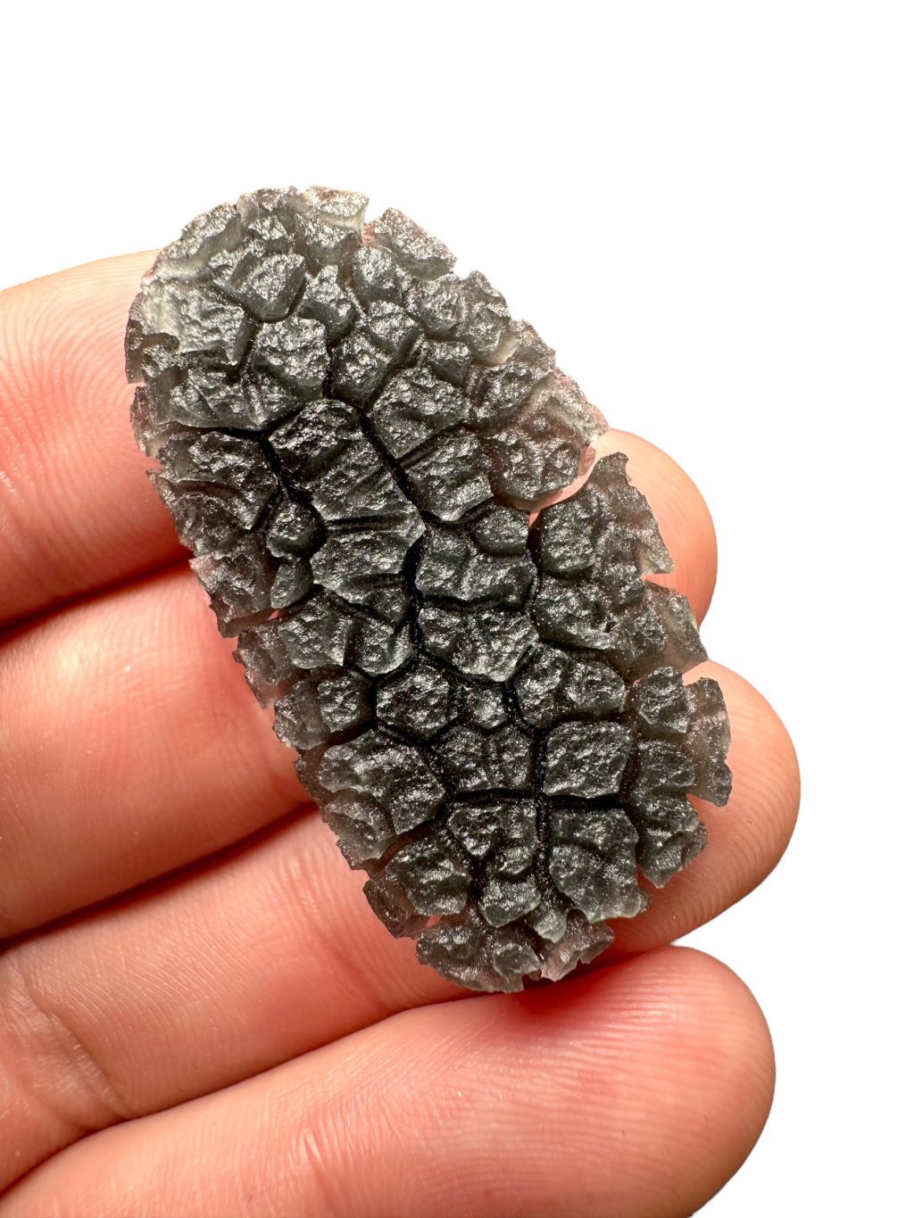 Dieser kürzlich entdeckte Obsidian-Typ gehört zu den schönsten Obsidiangesteinen der Welt. Er unterscheidet sich von anderen Obsidianarten durch seine ausgeprägt tiefe Struktur, die an südböhmische Moldavite erinnert (insbesondere an die Besednice Jezkovna). Seine Skulptur entstand durch schnelles Abkühlen, Aufreißen der Oberfläche und anschließende langsame Einwirkung von Bodensäuren an der jeweiligen Fundstelle – ähnlich wie bei Moldaviten. Die genaue Fundstelle wird derzeit aus Schutzgründen geheim gehalten, um Raubgrabungen und mögliche Zerstörungen der Landschaft zu verhindern. Wir glauben, dass das weltweite Interesse an diesem seltenen und ästhetisch ansprechenden Obsidian rapide zunehmen wird, sobald die genaue Lokalität offengelegt und wissenschaftlich untersucht wird – insbesondere aufgrund seines hohen Potenzials für die Verwendung in der Schmuckindustrie.