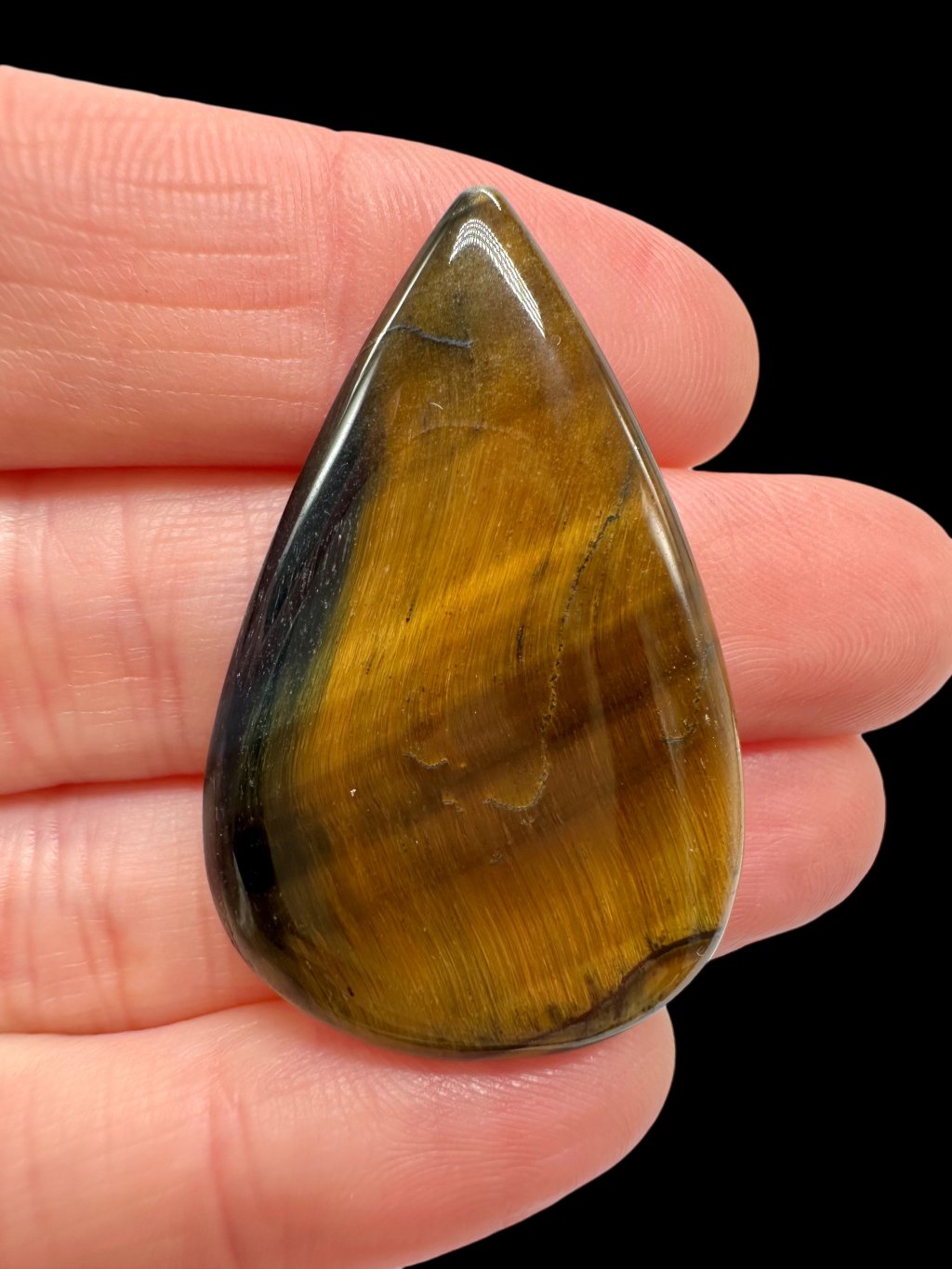 Der Cabochonschliff mit seiner glatten, abgerundeten Oberfläche lässt den für Tigerauge typischen optischen Effekt vollständig zur Geltung kommen. Die Ausrichtung der Mineralstruktur beim Schleifen beeinflusst die Intensität und Richtung des Lichtbandes. Die polierte Oberfläche verstärkt den natürlichen Glanz und die Farbtiefe des Steins.