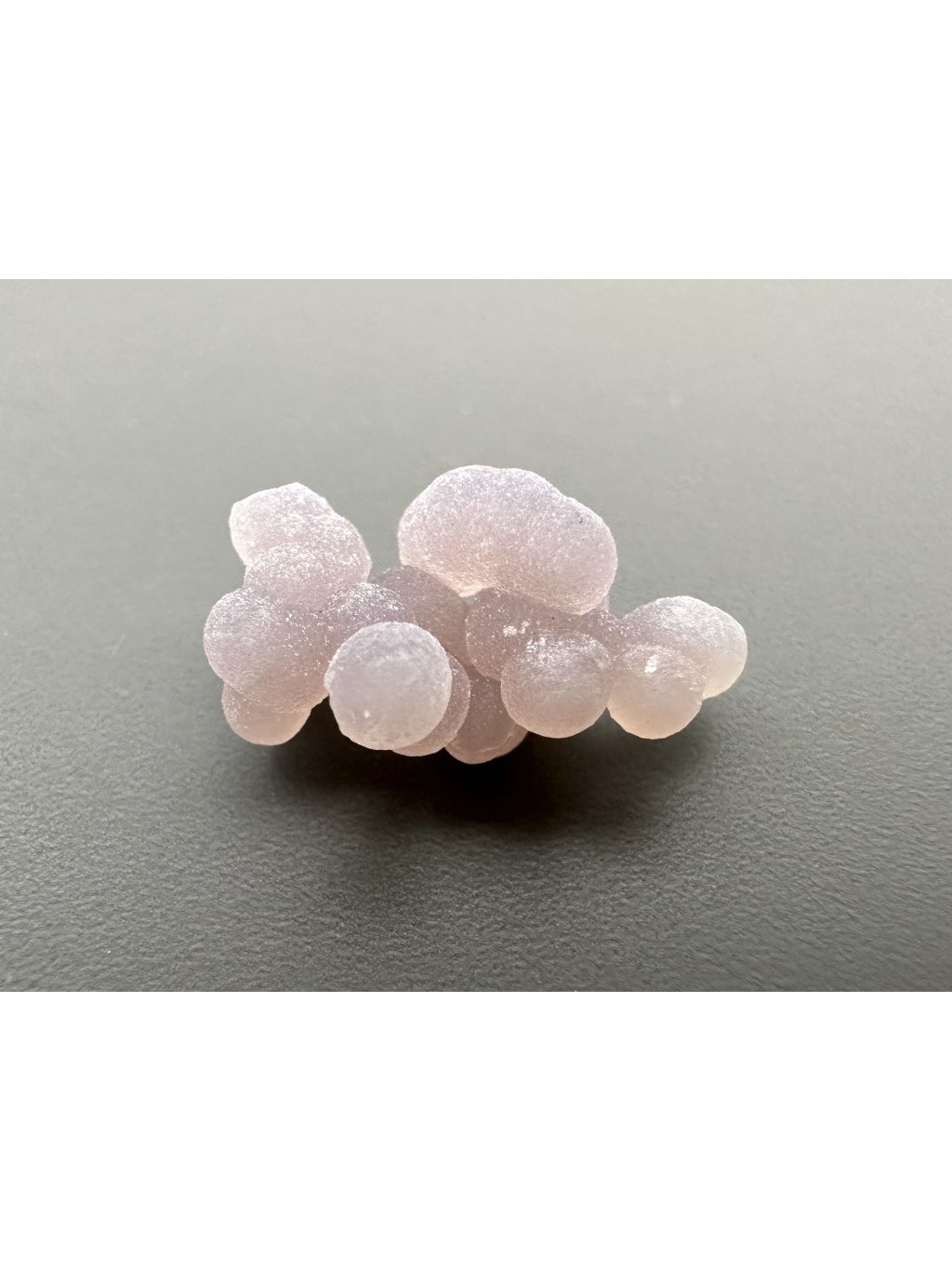 Traubenchalcedon ist eine relativ neue Entdeckung auf dem Mineralienmarkt. Die ersten Proben wurden 2016 auf der indonesischen Insel Sulawesi gefunden, und zwar im Gebiet von Manakarra. Traubenchalcedon ist eine Varietät von Quarz und zeichnet sich durch charakteristische kugelförmige Aggregate aus, die als Sphärolithen bezeichnet werden und durch Ausfällung aus kieselsäurereichen (SiO₂) geleeartigen Lösungen entstehen. Diese kugelförmigen Strukturen, die oft bis zu 1 cm groß sind, bestehen aus feinen Fäden gleicher Länge, die dicht aneinander gepackt sind. Die einzelnen Kugeln sind oft miteinander oder mit dem darunter liegenden Gestein verschmolzen und bilden eine Form, die an eine Weintraube erinnert, daher auch der Name.