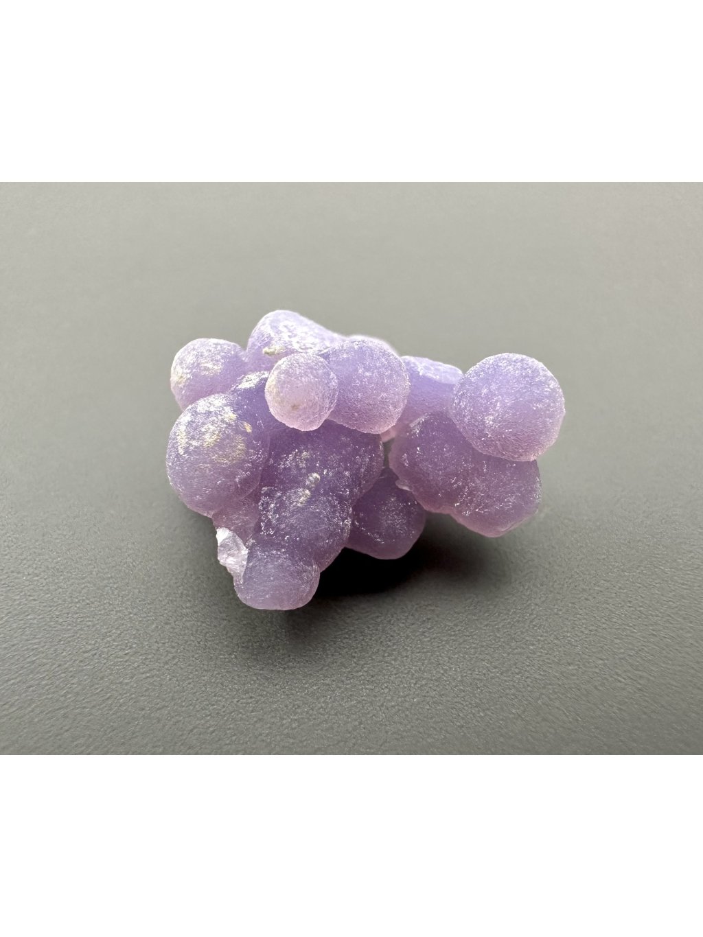 Traubenchalcedone sind bekannt für ihre zarten bis intensiven Farben, insbesondere Violett und Grün. Die violette Farbe wird durch das Vorhandensein von Manganverursacht, während die selteneren grünen Exemplare ihre Farbe durch andere Verunreinigungen im Gestein erhalten. Die Proben können auch mit winzigen Quarzkristallen bedeckt sein, die ihnen ein glänzendes Aussehen verleihen.