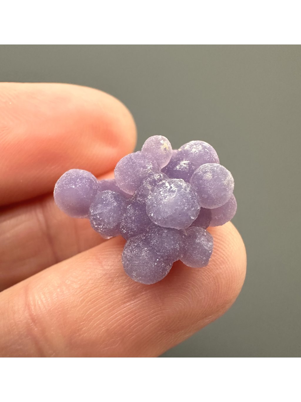 Traubenchalcedon ist eine relativ neue Entdeckung auf dem Mineralienmarkt. Die ersten Proben wurden 2016 auf der indonesischen Insel Sulawesi gefunden, und zwar im Gebiet von Manakarra. Traubenchalcedon ist eine Varietät von Quarz und zeichnet sich durch charakteristische kugelförmige Aggregate aus, die als Sphärolithen bezeichnet werden und durch Ausfällung aus kieselsäurereichen (SiO₂) geleeartigen Lösungen entstehen. Diese kugelförmigen Strukturen, die oft bis zu 1 cm groß sind, bestehen aus feinen Fäden gleicher Länge, die dicht aneinander gepackt sind. Die einzelnen Kugeln sind oft miteinander oder mit dem darunter liegenden Gestein verschmolzen und bilden eine Form, die an eine Weintraube erinnert, daher auch der Name.
