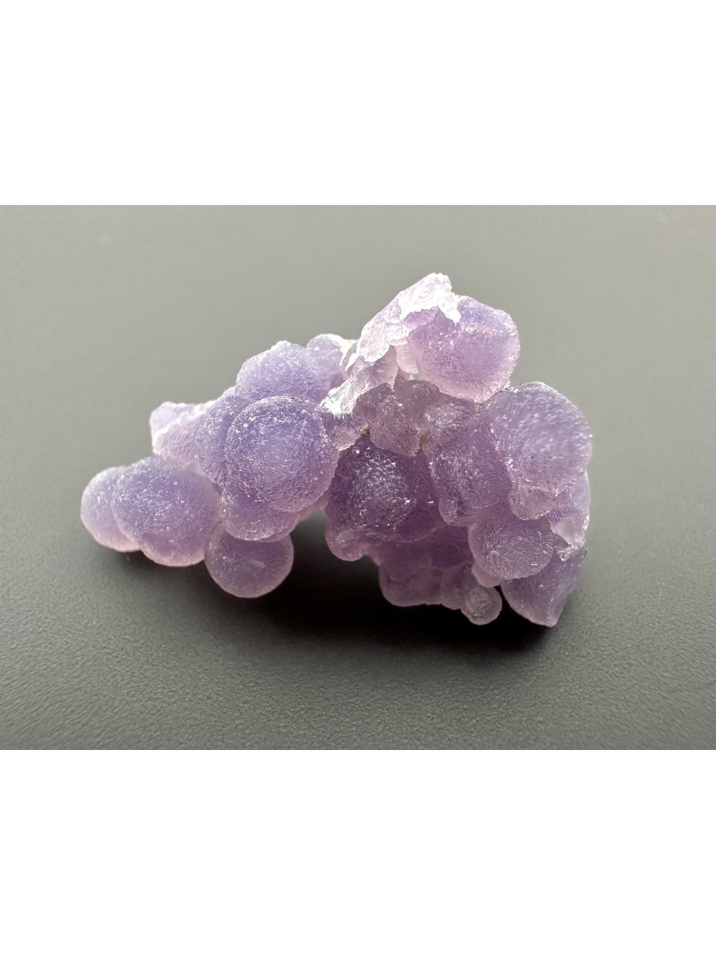 Traubenchalcedone sind bekannt für ihre zarten bis intensiven Farben, insbesondere Violett und Grün. Die violette Farbe wird durch das Vorhandensein von Manganverursacht, während die selteneren grünen Exemplare ihre Farbe durch andere Verunreinigungen im Gestein erhalten. Die Proben können auch mit winzigen Quarzkristallen bedeckt sein, die ihnen ein glänzendes Aussehen verleihen.