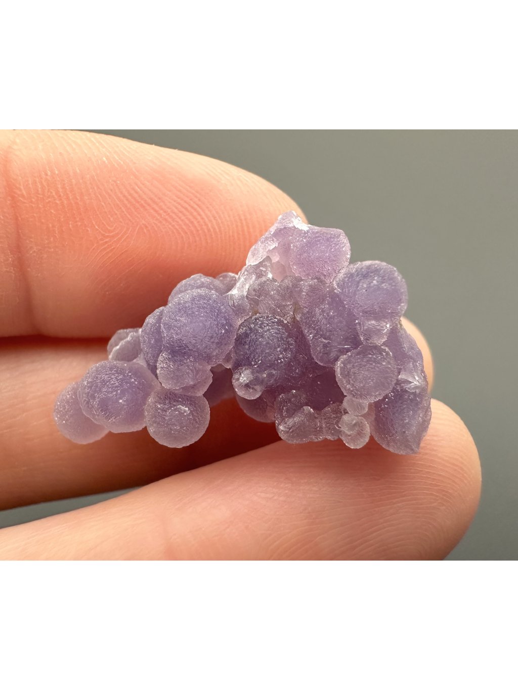 Traubenchalcedon ist eine relativ neue Entdeckung auf dem Mineralienmarkt. Die ersten Proben wurden 2016 auf der indonesischen Insel Sulawesi gefunden, und zwar im Gebiet von Manakarra. Traubenchalcedon ist eine Varietät von Quarz und zeichnet sich durch charakteristische kugelförmige Aggregate aus, die als Sphärolithen bezeichnet werden und durch Ausfällung aus kieselsäurereichen (SiO₂) geleeartigen Lösungen entstehen. Diese kugelförmigen Strukturen, die oft bis zu 1 cm groß sind, bestehen aus feinen Fäden gleicher Länge, die dicht aneinander gepackt sind. Die einzelnen Kugeln sind oft miteinander oder mit dem darunter liegenden Gestein verschmolzen und bilden eine Form, die an eine Weintraube erinnert, daher auch der Name.