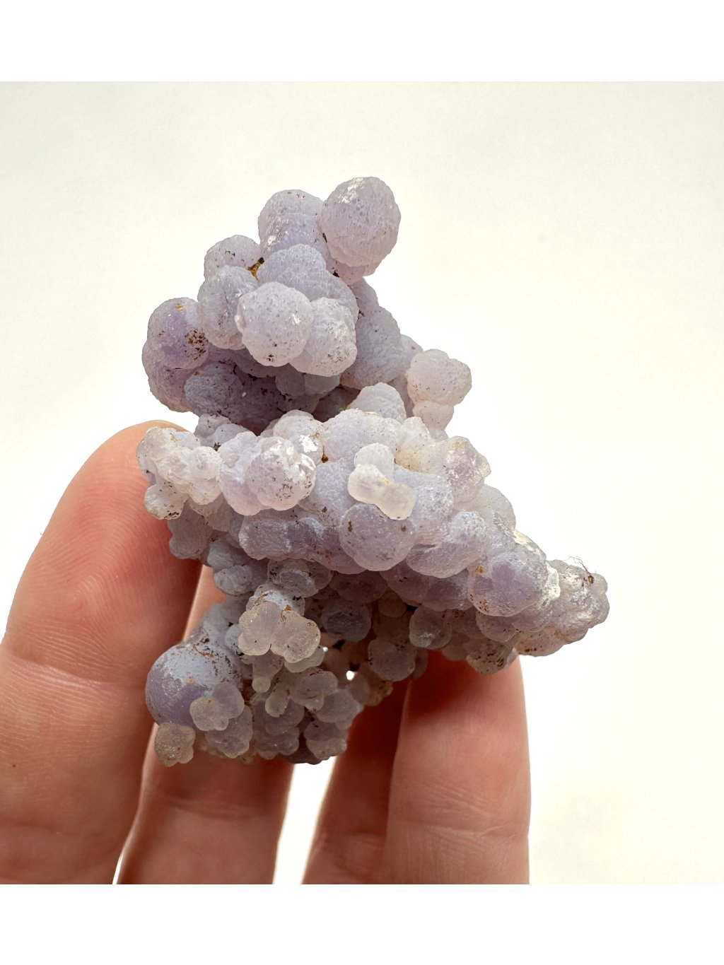 Traubenchalcedone sind bekannt für ihre zarten bis intensiven Farben, insbesondere Violett und Grün. Die violette Farbe wird durch das Vorhandensein von Manganverursacht, während die selteneren grünen Exemplare ihre Farbe durch andere Verunreinigungen im Gestein erhalten. Die Proben können auch mit winzigen Quarzkristallen bedeckt sein, die ihnen ein glänzendes Aussehen verleihen.