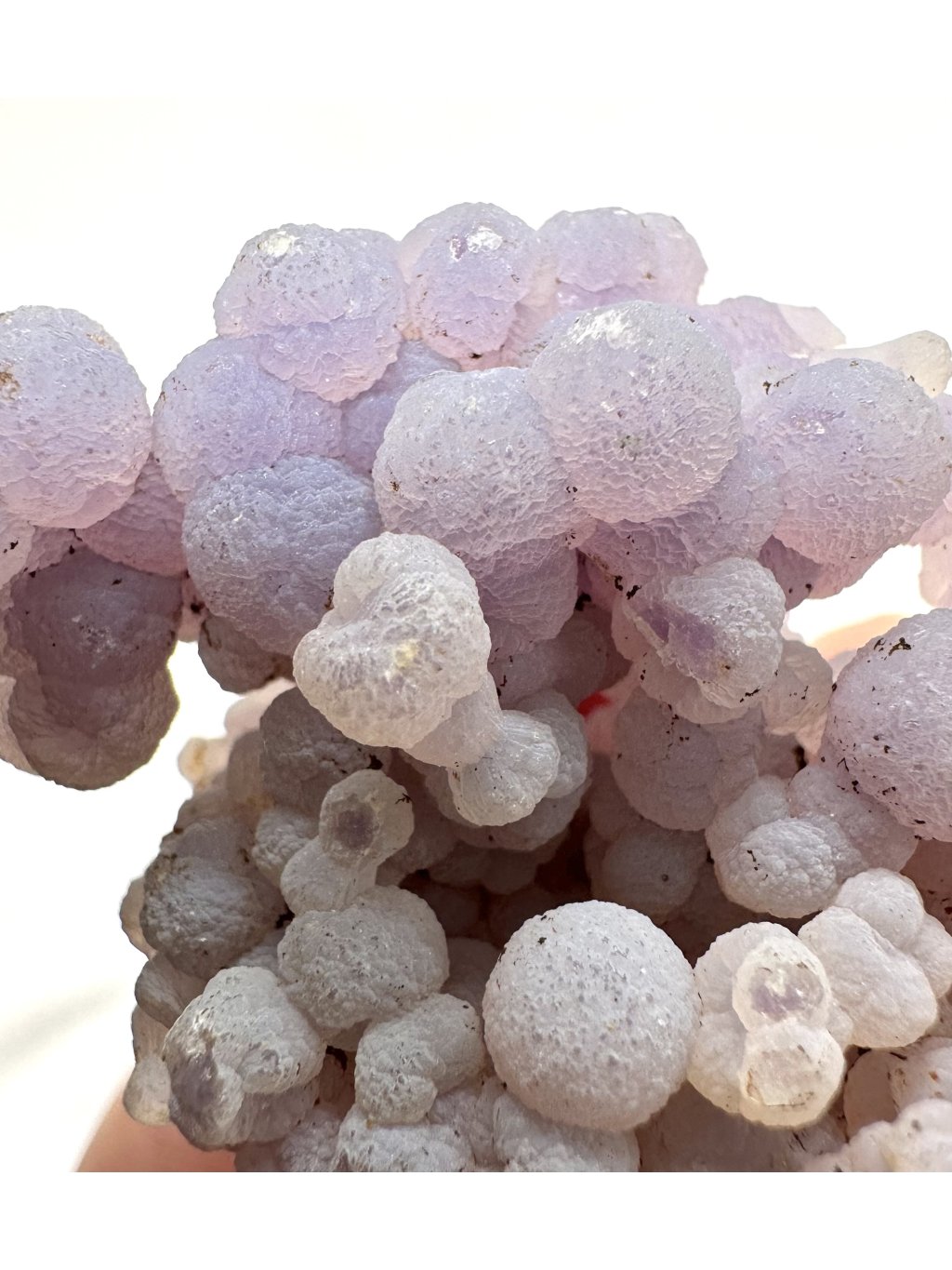 Traubenchalcedon ist eine relativ neue Entdeckung auf dem Mineralienmarkt. Die ersten Proben wurden 2016 auf der indonesischen Insel Sulawesi gefunden, und zwar im Gebiet von Manakarra. Traubenchalcedon ist eine Varietät von Quarz und zeichnet sich durch charakteristische kugelförmige Aggregate aus, die als Sphärolithen bezeichnet werden und durch Ausfällung aus kieselsäurereichen (SiO₂) geleeartigen Lösungen entstehen. Diese kugelförmigen Strukturen, die oft bis zu 1 cm groß sind, bestehen aus feinen Fäden gleicher Länge, die dicht aneinander gepackt sind. Die einzelnen Kugeln sind oft miteinander oder mit dem darunter liegenden Gestein verschmolzen und bilden eine Form, die an eine Weintraube erinnert, daher auch der Name.