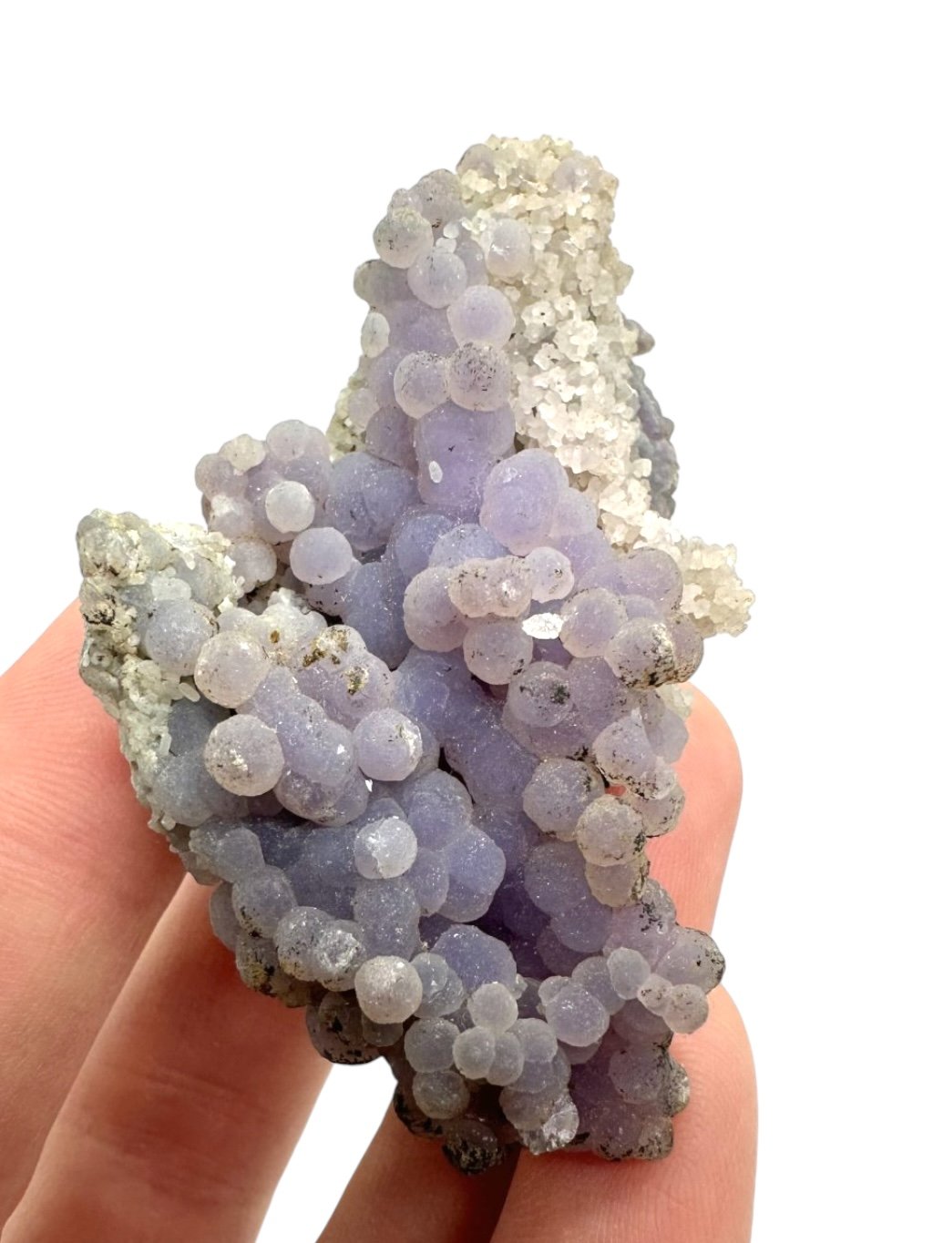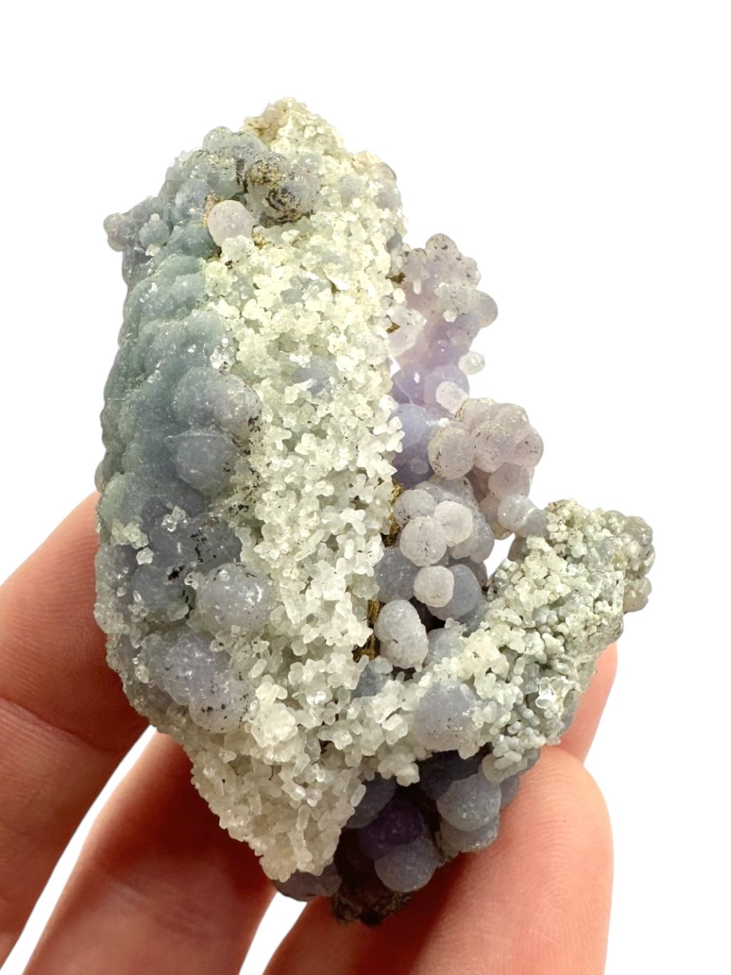 Traubenchalcedone sind bekannt für ihre zarten bis intensiven Farben, insbesondere Violett und Grün. Die violette Farbe wird durch das Vorhandensein von Manganverursacht, während die selteneren grünen Exemplare ihre Farbe durch andere Verunreinigungen im Gestein erhalten. Die Proben können auch mit winzigen Quarzkristallen bedeckt sein, die ihnen ein glänzendes Aussehen verleihen.