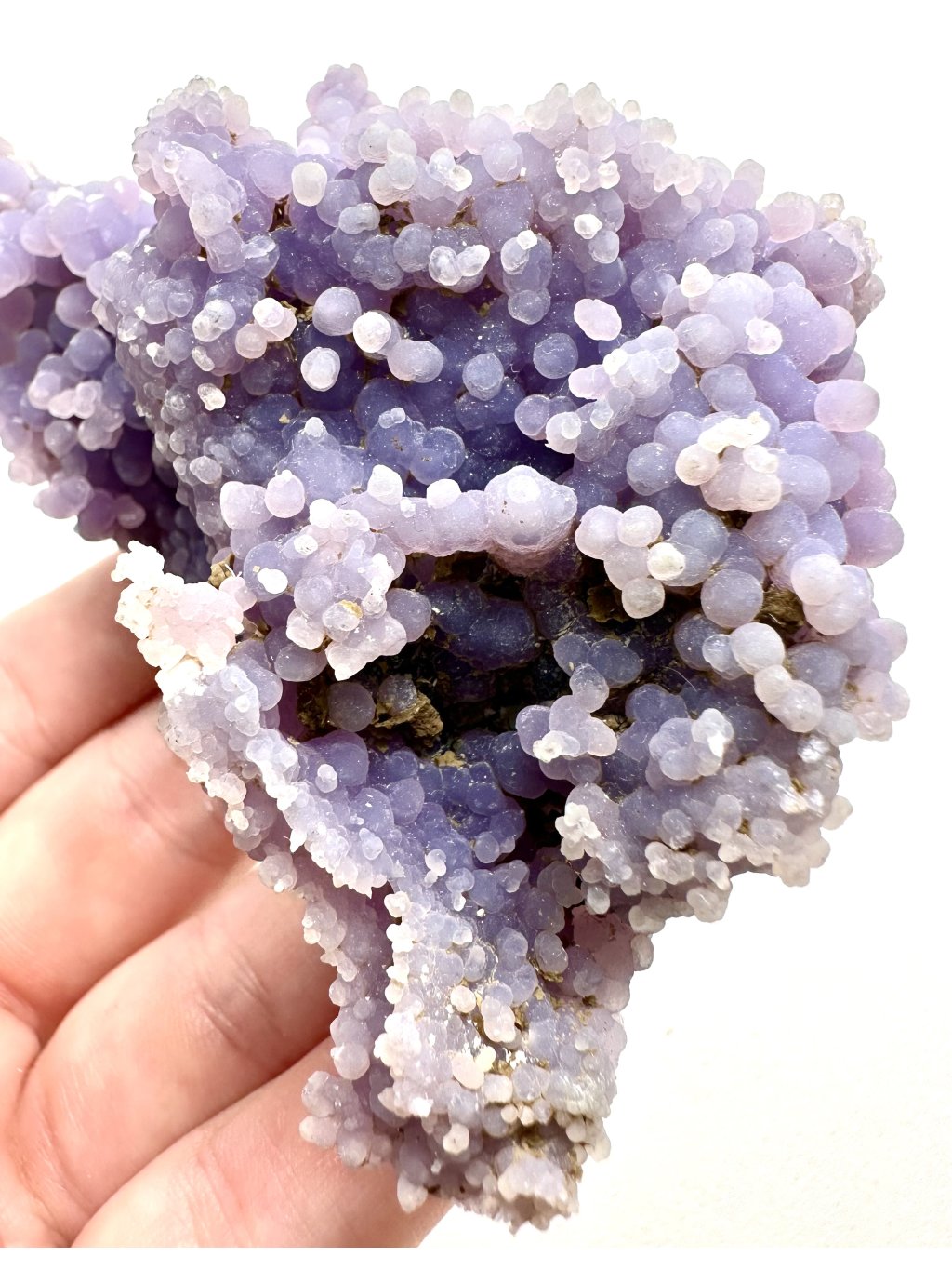 Traubenchalcedone sind bekannt für ihre zarten bis intensiven Farben, insbesondere Violett und Grün. Die violette Farbe wird durch das Vorhandensein von Manganverursacht, während die selteneren grünen Exemplare ihre Farbe durch andere Verunreinigungen im Gestein erhalten. Die Proben können auch mit winzigen Quarzkristallen bedeckt sein, die ihnen ein glänzendes Aussehen verleihen.