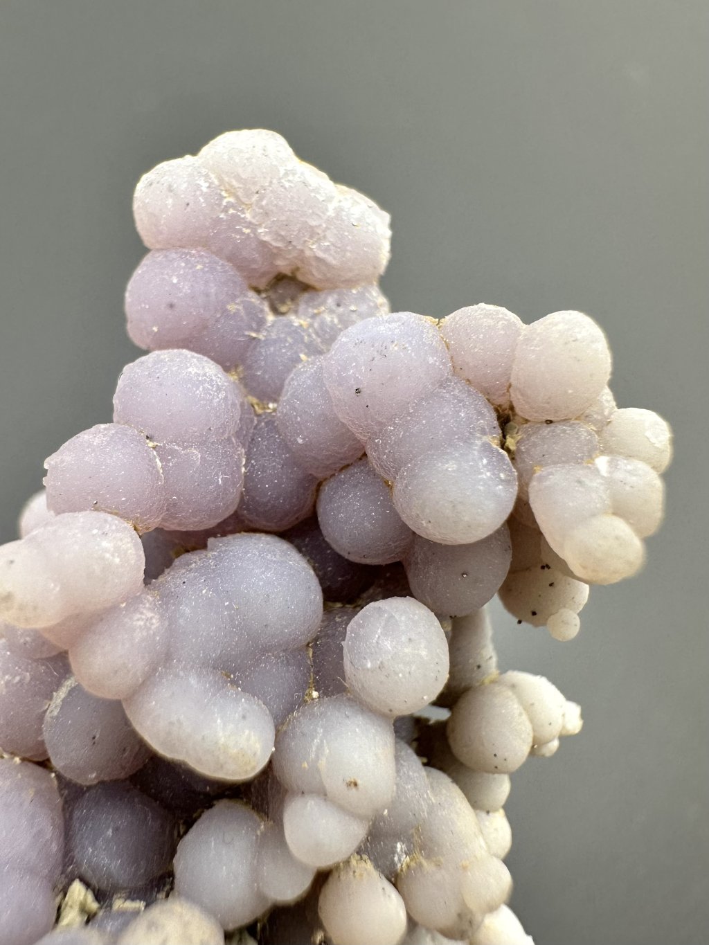 Traubenchalcedon ist eine relativ neue Entdeckung auf dem Mineralienmarkt. Die ersten Proben wurden 2016 auf der indonesischen Insel Sulawesi gefunden, und zwar im Gebiet von Manakarra. Traubenchalcedon ist eine Varietät von Quarz und zeichnet sich durch charakteristische kugelförmige Aggregate aus, die als Sphärolithen bezeichnet werden und durch Ausfällung aus kieselsäurereichen (SiO₂) geleeartigen Lösungen entstehen. Diese kugelförmigen Strukturen, die oft bis zu 1 cm groß sind, bestehen aus feinen Fäden gleicher Länge, die dicht aneinander gepackt sind. Die einzelnen Kugeln sind oft miteinander oder mit dem darunter liegenden Gestein verschmolzen und bilden eine Form, die an eine Weintraube erinnert, daher auch der Name.