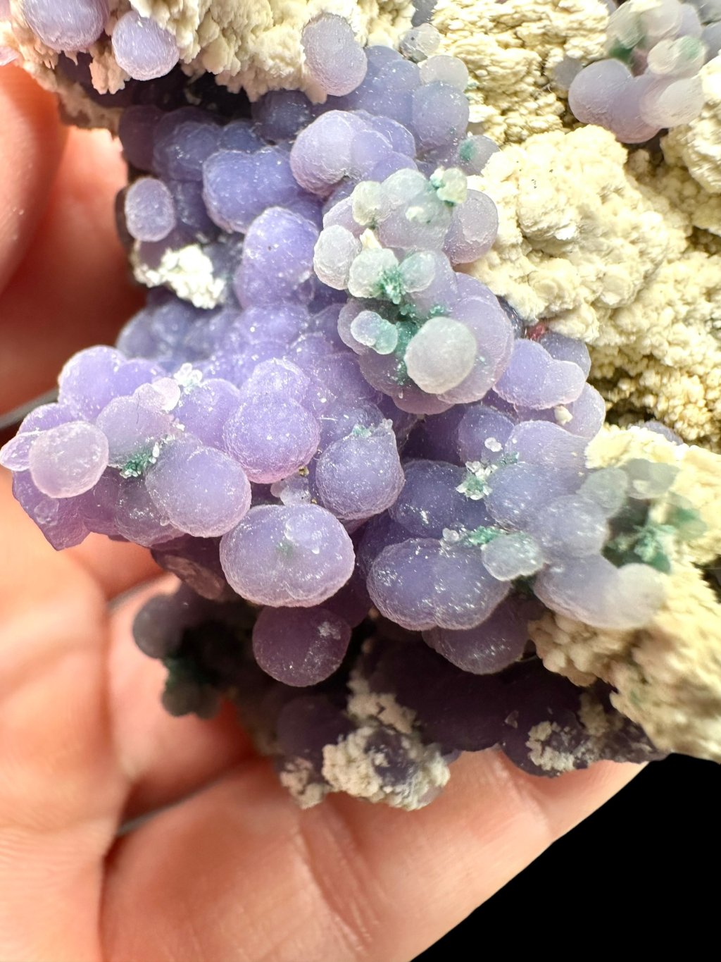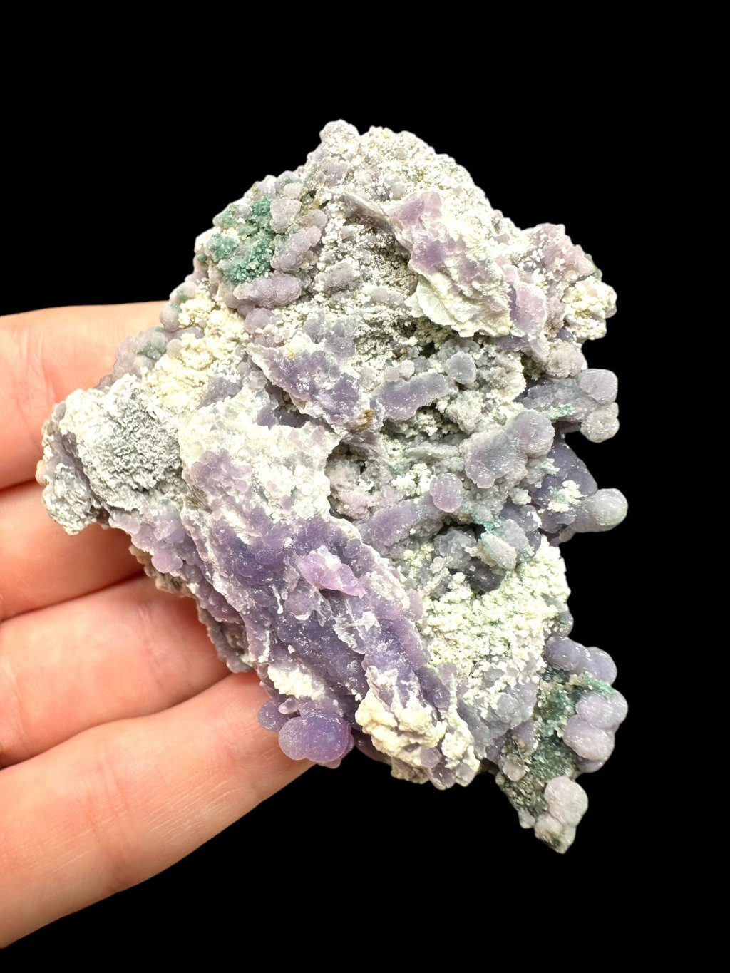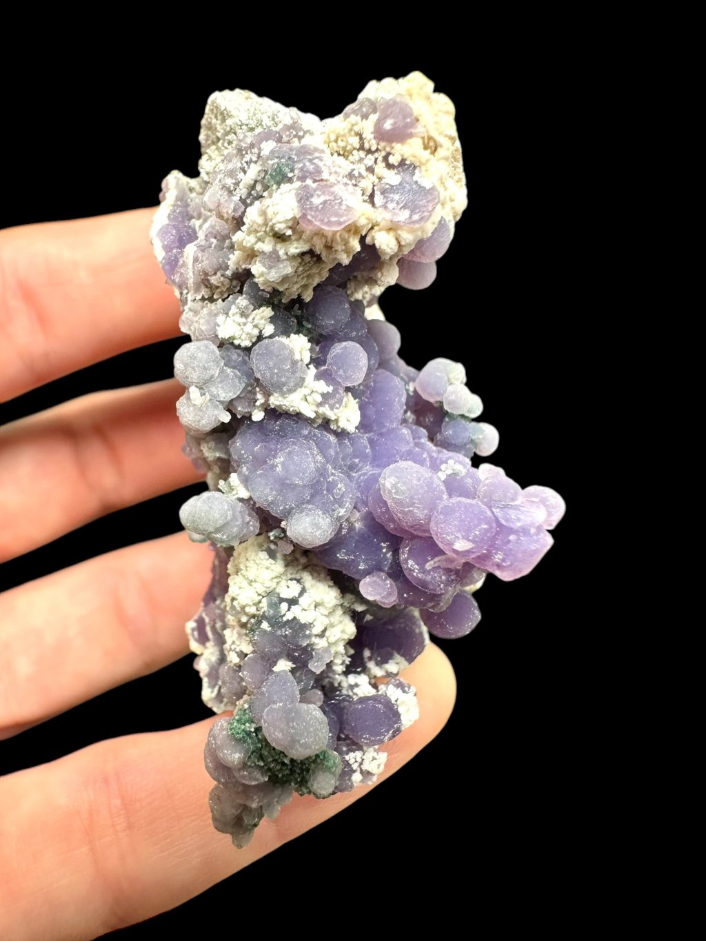 Traubenchalcedone sind bekannt für ihre zarten bis intensiven Farben, insbesondere Violett und Grün. Die violette Farbe wird durch das Vorhandensein von Manganverursacht, während die selteneren grünen Exemplare ihre Farbe durch andere Verunreinigungen im Gestein erhalten. Die Proben können auch mit winzigen Quarzkristallen bedeckt sein, die ihnen ein glänzendes Aussehen verleihen.